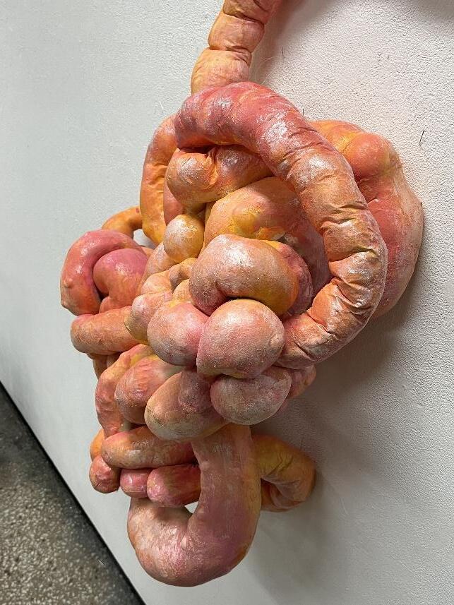 本學期第二個創作主題是「squishy sculpture」。這次的創作著重於柔軟材質的應用與結構 設計,與以往探討內外空間的支撐結構不同。在製作過程中,我學習到如何平衡形體的穩定 性與材料的柔韌性,並嘗試讓作品在外觀上更具趣味性與互動性。從同學之間的 critique 獲 益良多,雖然這門課程是開給二年級的學生,但是同學們的實作能力的成熟度、靈感概念延 伸,以及整體完整度讓我對作品的表達方式有了新的思考,例如如何透過手感與視覺效果來