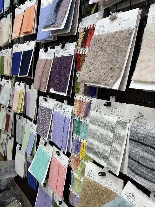 原本的創作計畫是製作一套針織毛衣,為此我特地前往東大門傳統市場尋找合適的材料。不 過,手搖針織機對於紗線的粗細有一定限制,而市面上販售的紗線多為粗毛線或混紡線,能 夠使用在手搖機上的細絞紗相對稀少。我在少數幾間店中才找到合適的材料,並花費大量時