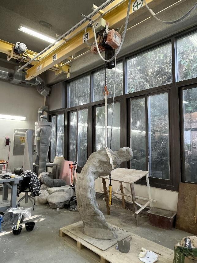 雕塑教室周圍有許多創作中的作品,能夠一窺大型 雕塑品在創作時是如何對抗地心引裡固定而成型的。