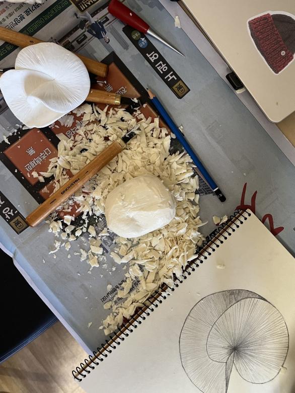 Carving 課程則以觀摩和分析大量不同風格的雕塑作品為主,透過欣賞各種雕塑形式來拓展 視野。老師安排了多次作品分析討論,從形態、材料、構圖和表現手法等多個角度進行解析, 並鼓勵我們多去思考雕塑作品在空間中的存在方式。在觀摩後,我們開始繪製簡單草圖,並 利用肥皂、石膏及陶土等材料進行模型製作。這些材料各自擁有不同的 特性:肥皂質地柔軟、