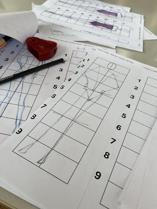 動作張力上有著顯著差異,這些都需要重新調整繪圖時的感知與比例掌握。同時也針對不同 領型與上衣款式進行觀察與繪圖練習,觀察整體輪廓與視覺重點。