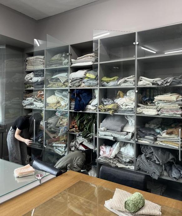 老師帶我們去研究生的教室找自己下個單元可以運 用的材料,有很多超棒的布料,先拿了一些製作 sample。