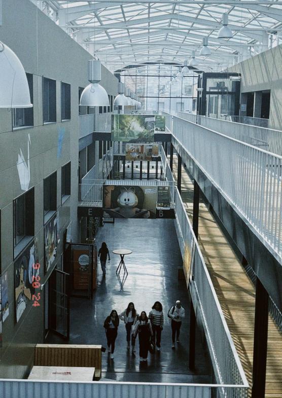 周進行一個作品專案,會邀請業界不同的動畫師進行授課。同時在同一校區學習的學生 會有三年制的學生,我們會在不同的演講課程、工作坊相遇,所以時常有機會能與不同與班 級的同學互相交流。我初踏進學校馬上能夠感受到獨特的空間規劃,整棟建築分為一到三樓, 陳設許多動畫工作室的作品展出,以及有許多安錫影展的宣傳視覺,同時由於安錫校區的設 計本身並不只專屬於學校,而其中會有許多的動畫工作室進駐於建築中,我們 也能看到校園