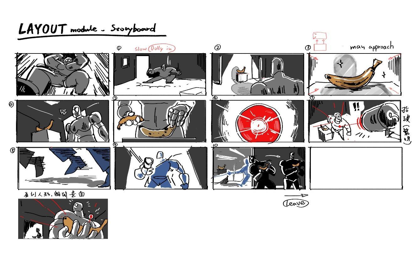 針對此次作業所繪製簡單的 Animatic,跟老師討 論時能快速告訴他自己想呈現的點子。