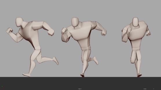 跑步動畫(RunCycle)的三視圖,我使用較為魁 武的角色進行動態設計,因此跑步起來我也想呈 現的是角色的發力的重量感。