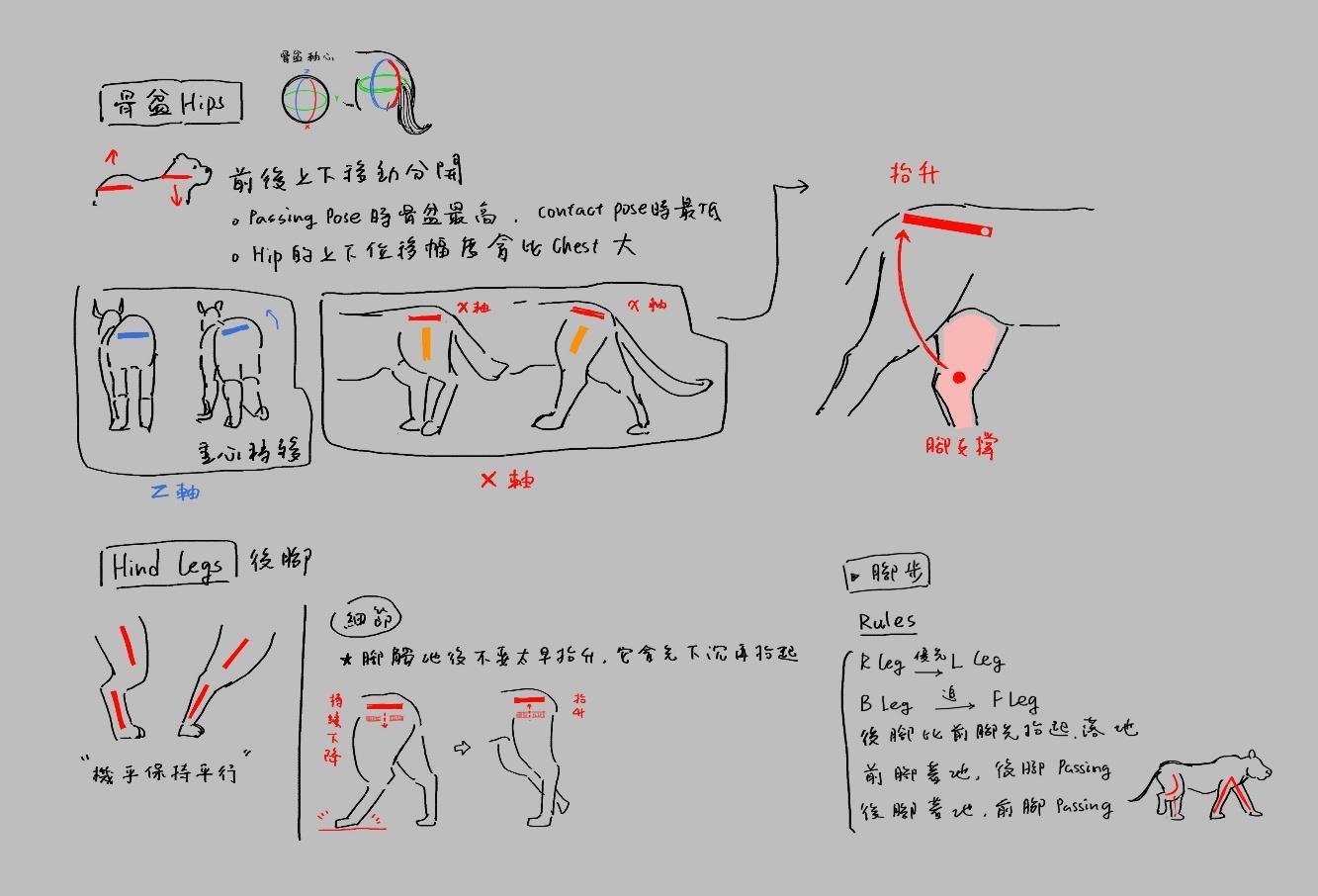 針對動物骨盆及後腳的筆記紀錄,關於四足動物動畫表演的細節。