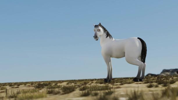 四足動物表演的成品動畫,動畫呈現馬匹衝刺跳起並急停的表演。