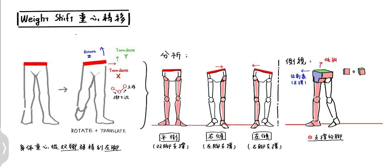 ⚫ 重心轉移時要思考骨盆(Root)往哪一腳平衡,靠齊哪一隻腳也會往那向下旋轉。