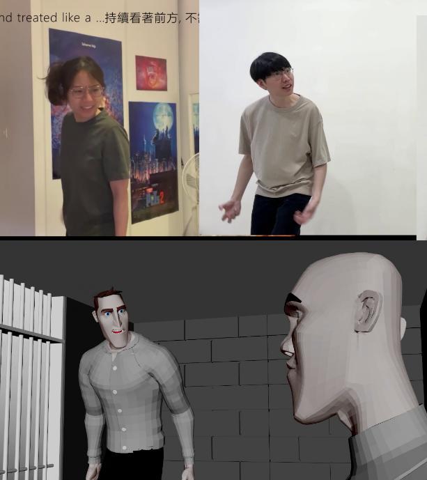 在七月的製作期從主題制定>拍攝 Reference>Blocking 為主軸,為了不浪費時間再多做 出一個不夠適合展現的作品集作品,我與導師在初期訂定出的製作方向為:加強 Body Mechanics 以及 Face Expression 的作品,最多兩隻角色、兩個 Cut 的對話。因此我的作品 選擇是雙人鏡頭,故事是一個被誣陷入獄的人和已經被關押很久的犯人在一個牢籠裡的對話, 主角穿著白襯衫,但帶有一點血漬跟髒污,犯人可以是穿著骯髒的囚犯服,暗示他被關押很 久了。