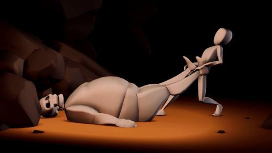 此次作業的完成動畫,故事描述角色拉出一個被 埋在石頭裡的人。專案需要著重表現拉動重物的 身體機制。