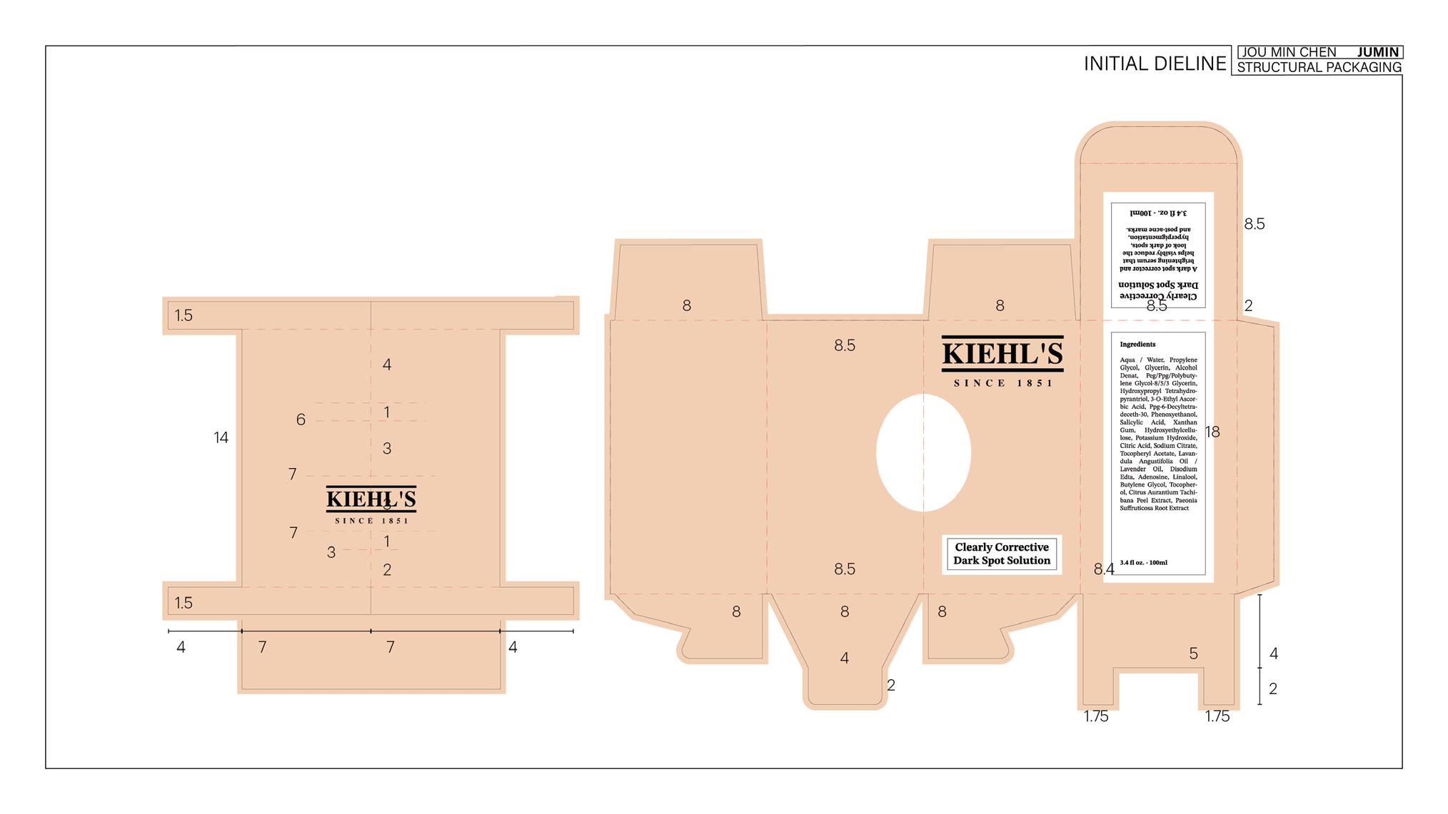 在這個專案中,我特別專注在,我希望整個包裝能盡量攤平進行回收。而我的產品則是選擇Kiehl's Clearly Corrective Dark Spot Solution。後來我發展出一個非常規則的矩形,只透過幾筆刀模和摺痕便 能便形成insert。這個形狀讓生產方在大量製造時,不會產生過多邊角料。非常節省成本,同時也方便 攤平回收。透過推動底部的一個小凹凸槽,可以輕鬆裝載跟卸下產品本身。