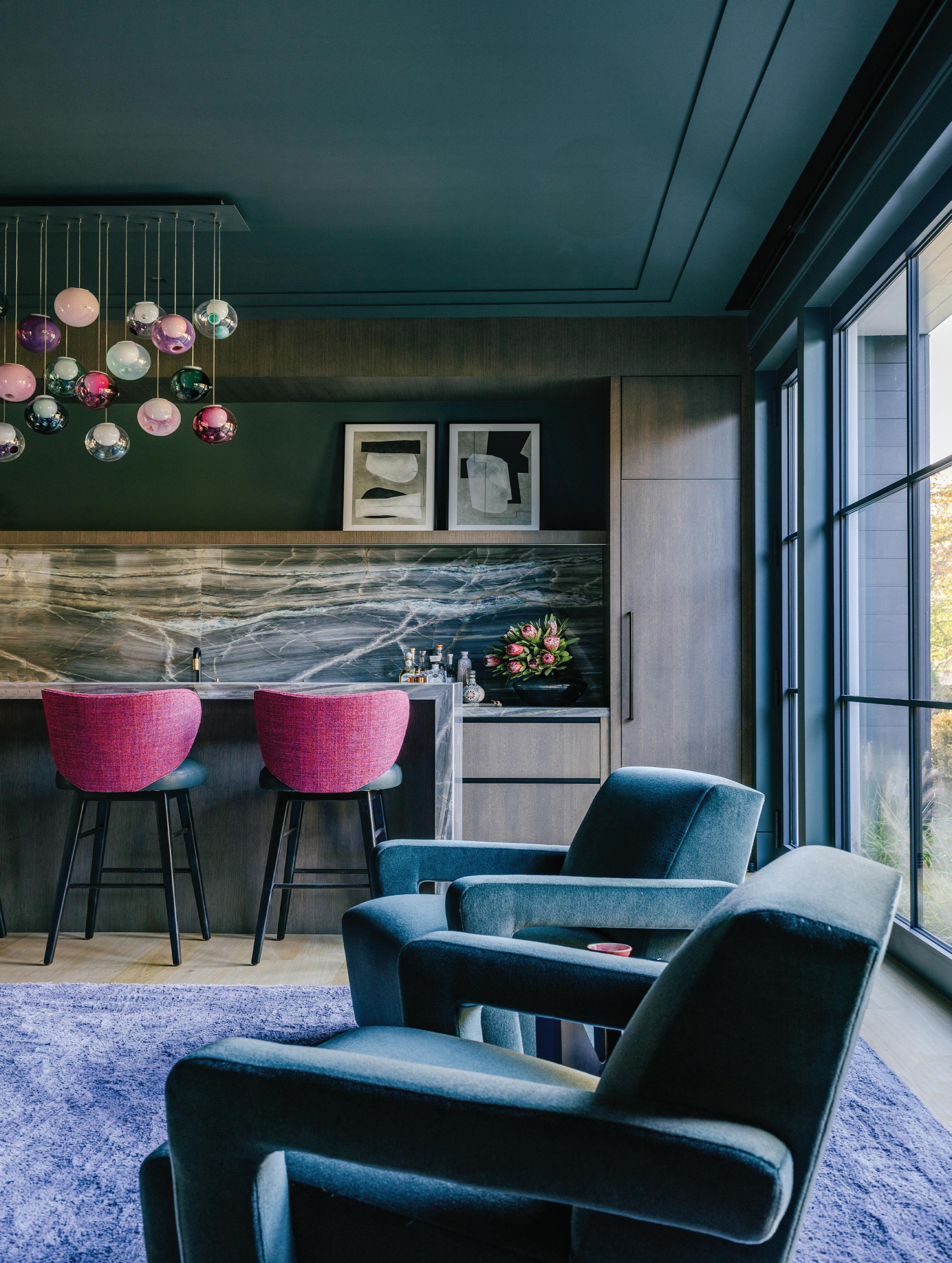 above: Clé tiles create a Deco backsplash at the bar. Cabinetry and trim are painted in Bewitched by Benjamin Moore. Schuyler Samperton fabric on the Roman shade and mini table lamp add complementary blue and green tones to the mix. right: Floe Painting added Benjamin Moore’s Prussian Blue lacquer to the dining room. The Chaddock table is surrounded by custom dining chairs, which Woodmansee created with Luther Quintana Upholstery. Visual Comfort chandeliers lend light to family dinners and friendly gatherings.