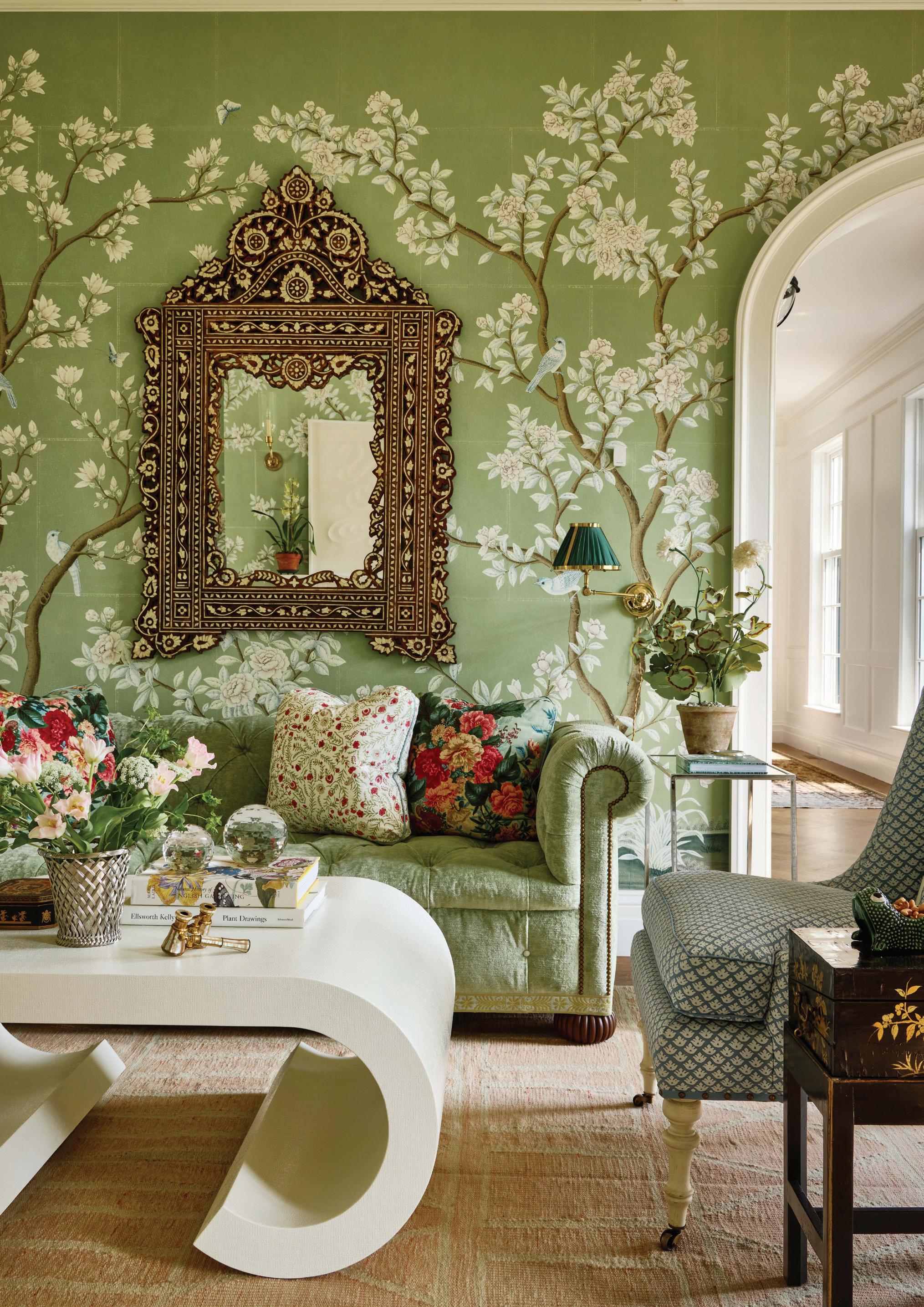above: Usually reserved for dining rooms, Gracie wallpaper wraps the living room walls. Woodmansee found the mirror at Stamford’s Antique & Artisan Gallery. opposite page: The wife was inspired by John Derian’s layered style. His prints sit over the sofa in this seating area, layered with its own mix of pattern and color.