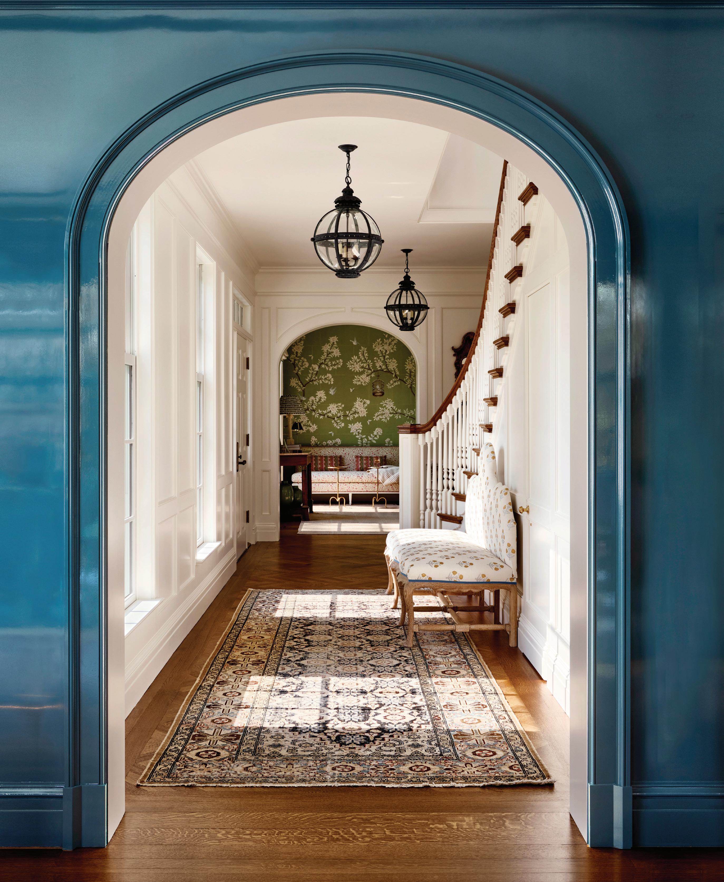 above: Elegant detailing with historic roots makes this Colonial Revival home an instant classic. opposite page: A view through one of many arched doorways into the stair hall, with a rug resized by Eliko, Vaughan light fixtures and a custom settee by Luther Quintana Upholstery using John Robshaw fabric.