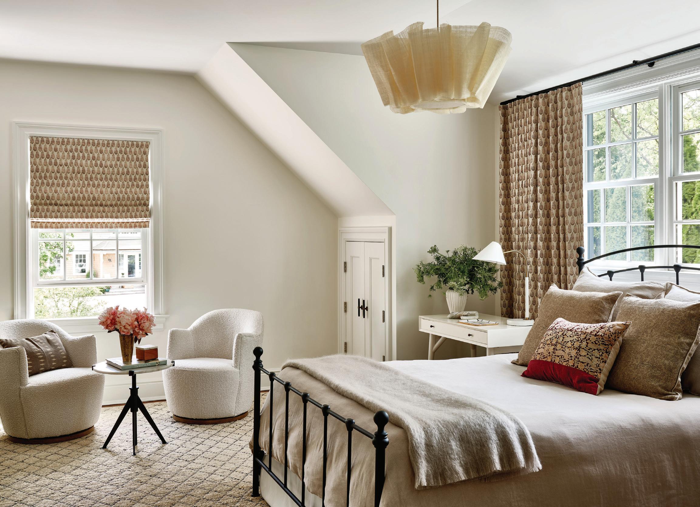 this photo: Custom Schumacher drapery frames the window of this calm primary bedroom.