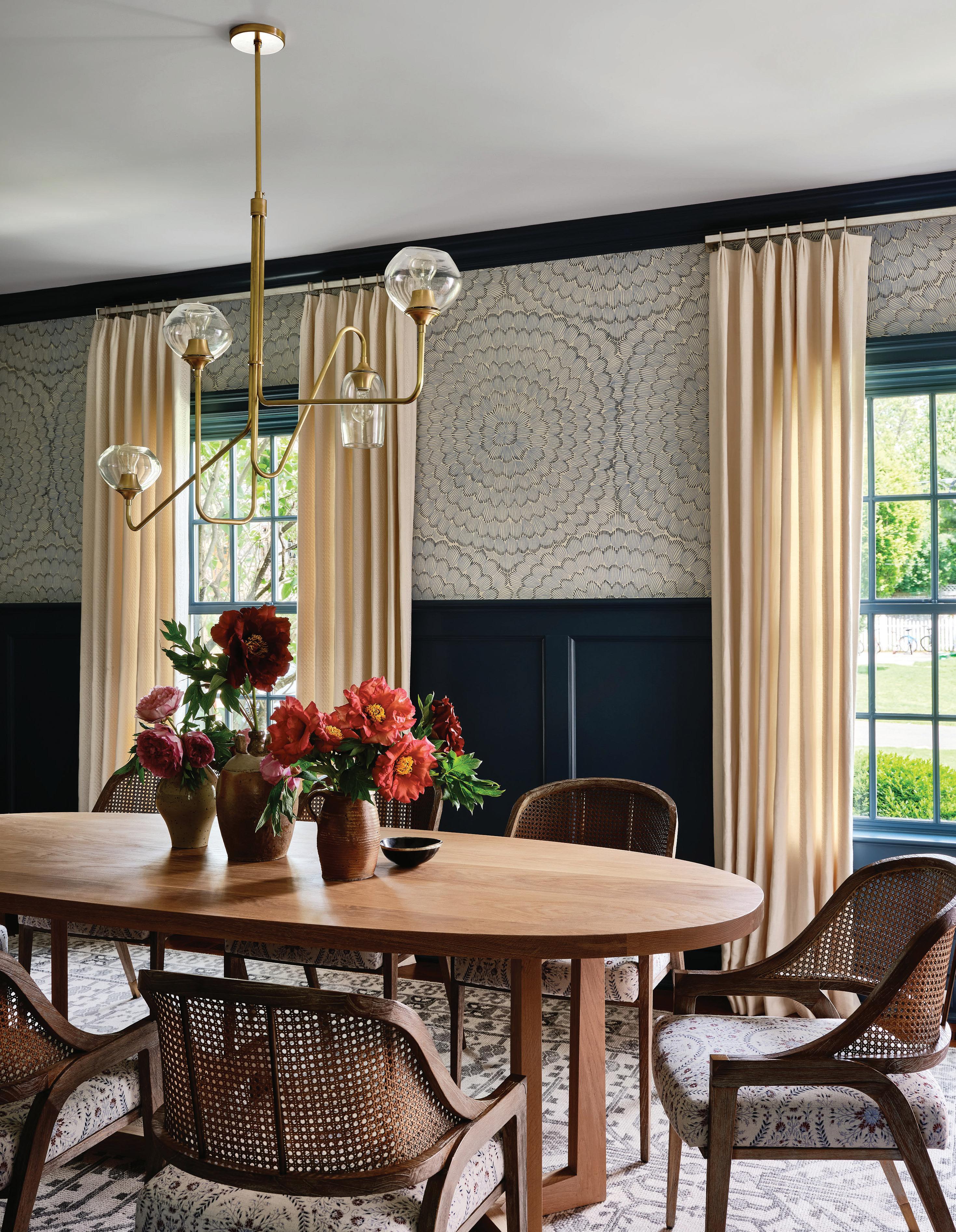 this photo: The blue grasscloth in the dining room serves as a contrast to the brighter kitchen. Plenty of light streams in, helped by Workstead sconces and Faina pendant. left: Ricci cleverly added the steel window to visually open the spaces between the kitchen and dining spaces.