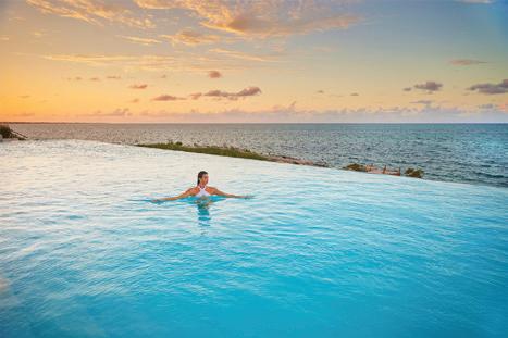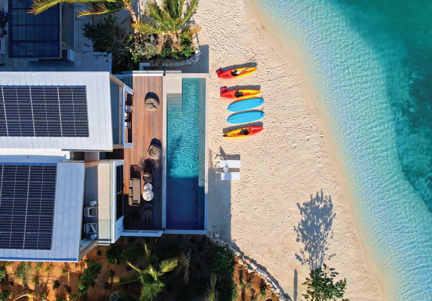 pieces that complement the ocean blues, on display through walls of expansive windows. There is plenty of room to spread out—from 5,500 all the way up to 20,000 square feet— ensuring family and friends can coexist comfortably. Kids will love claiming their beds (bunks abound) and scoping out the media and game rooms. All villas take advantage of indoor/ outdoor living, with daily pool and beach setup available upon request. Arrange a morning yoga session on your deck, and end your evening with a meal prepared by a pro in your chef’s kitchen, courtesy of the crew at the nearby flagship Grace Bay Club. Celebrating a milestone birthday? Your reservation also includes a photo session to commemorate your stay, ensuring your island escape
