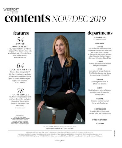 WESTPORT NOV/DEC 2019, VOL. 21, NO. 6. WESTPORT (USPS/ISSN 1941-9821) is published bi-monthly by Moffly Media, Inc., 205 Main St, Westport, CT 06880. Periodical postage paid at Westport, CT, and additional mailing offices. POSTMASTER: Send address changes (Form 3579) to WESTPORT PO BOX 9309, Big Sandy, TX 75755-9607. U.S. Subscription rates: $19.95/1 year, $34.95/2 years; Canada and Foreign $44/1 year, $72/2 years. westportmag.com