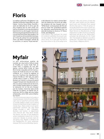 Myfair Le plus aristocratique quartier de Londres est situĂ© entre Oxford street et Picadilly et touche Hyde Park et Green Park. Il englobe les rues Ă©lĂ©gantes comme Bond Street et New Bond street, lesquelles attirent les boutiques de mode les plus en vue. RĂ©tro moderne, on y trouve le papetier le plus chic, Smythson (40, New Bond St), maison fondĂ©e en 1887 (Ah, ses petits carnets bleus Ă ligne !), Tiffany & Co, Burberry et Vuitton, ou encore le grand magasin Fenwick (60, New Bond st), rendez-vous de la mode et de lâart de vivre, avec sa belle façade digne dâun palace ; le restaurant du 1er est pris dâassaut par les modeux. Outre les clubs privĂ©s rĂ©servĂ©s Ă la gentry, le Mayfair est rĂ©putĂ© pour ĂȘtre le siĂšge des plus belles ambassades, entre Park Lane et Berkeley Square. The most aristocratic district of London is located between Oxford St and Piccadilly, right next to Hyde Park and Green Park. It includes elegant streets such as Bond Street and New Bond Street, kingdom of trendy shops. Meet Londonâs most stylish papermaker Symthson (40, New Bond Street) founded in 1887, Tiffany&Co, Burberry and Vuitton, or department store Fenwick (60, New Bond Street), the fashion and way of life rendezvous where trendsetters assault the 1st floor restaurant. Besides its private clubs for the gentry only, Mayfair is famed to be the headquarters for many embassies, between Park Lane and Berkeley Square.
