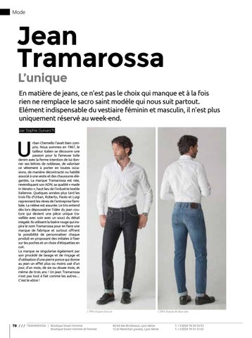 rban Chemello l’avait bien compris. Nous sommes en 1967, le tailleur italien se découvre une passion pour la fameuse toile denim avec la ferme intention de lui donner ses lettres de noblesse, de valoriser ce vêtement à porter en toutes occasions, de manière décontracté ou habillé associé à une veste et des chaussures élégantes. La marque Tramarossa est née, revendiquant son ADN, sa qualité « made in Veneto », haut lieu de l’industrie textile italienne. Quelques années plus tard les trois fils d’Urban, Roberto, Paolo et Luigi reprennent les rênes de l’entreprise familiale. La relève est assurée. Le trio entend dès lors dépoussiérer l’idée du jean couture qui devient une pièce unique travaillée avec soin avec un souci du détail inégalé. Ils utilisent la lisière rouge qui inspira le nom Tramarossa pour en faire une marque de fabrique et surtout offrent la possibilité de personnaliser chaque produit en proposant des initiales à fixer sur les poches et un choix d’étiquettes en cuir. La marque se singularise également par son procédé de lavage et de rinçage et d’utilisation d’une pierre ponce qui donne au jean un effet plus ou moins usé d’un jour, d’un mois, de six ou douze mois, et même de trois ans ! Un jean Tramarossa n’est pas tout à fait comme les autres… C’est le vôtre !