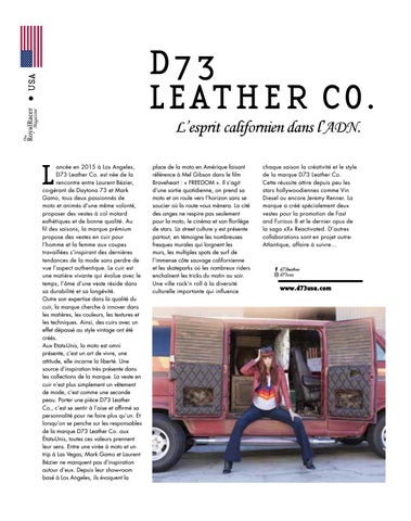 ancée en 2015 à Los Angeles, D73 Leather Co. est née de la rencontre entre Laurent Bézier, co-gérant de Daytona 73 et Mark Gamo, tous deux passionnés de moto et animés d’une même volonté, proposer des vestes à col motard esthétiques et de bonne qualité. Au fil des saisons, la marque prémium propose des vestes en cuir pour l’homme et la femme aux coupes travaillées s’inspirant des dernières tendances de la mode sans perdre de vue l’aspect authentique. Le cuir est une matière vivante qui évolue avec le temps, l’âme d’une veste réside dans sa durabilité et sa longévité. Outre son expertise dans la qualité du cuir, la marque cherche à innover dans les matières, les couleurs, les textures et les techniques. Ainsi, des cuirs avec un effet dépassé au style vintage ont été créés. Aux Etats-Unis, la moto est omni présente, c’est un art de vivre, une attitude, elle incarne la liberté. Une source d’inspiration très présente dans les collections de la marque. La veste en cuir n’est plus simplement un vêtement de mode, c’est comme une seconde peau. Porter une pièce D73 Leather Co., c’est se sentir à l’aise et affirmé sa personnalité pour ne faire plus qu’un. Et lorsqu’on se penche sur les responsables de la marque D73 Leather Co. aux États-Unis, toutes ces valeurs prennent leur sens. Entre une virée à moto et un trip à Las Vegas, Mark Gamo et Laurent Bézier ne manquent pas d’inspiration autour d’eux. Depuis leur show-room basé à Los Angeles, ils évoquent la
