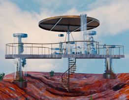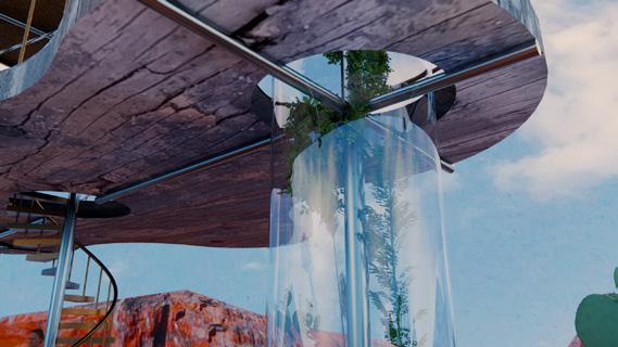My program consists of a greenhouse-esque observatory. The structure is a suspended wood roof held up by columns and cables. The columns provide movement and storage as well as structural support to the roof. The two tall terrariums house the plants, and the center column supports a spiral staircase to provide access to the floating floor. The space is not large, but is organized in a way that encourages movement between the varying visual experiences provided.