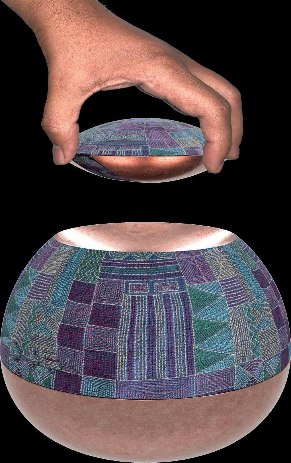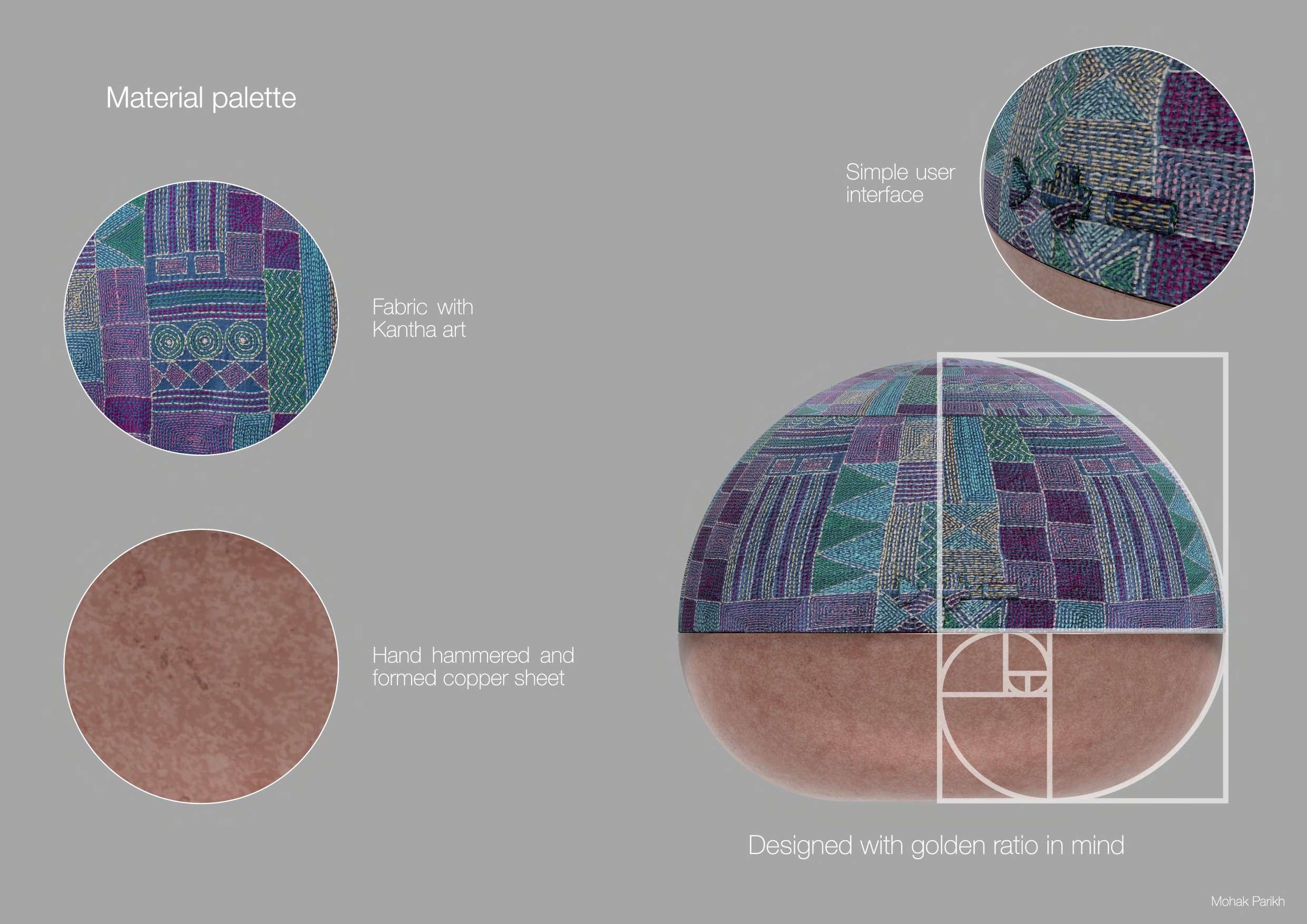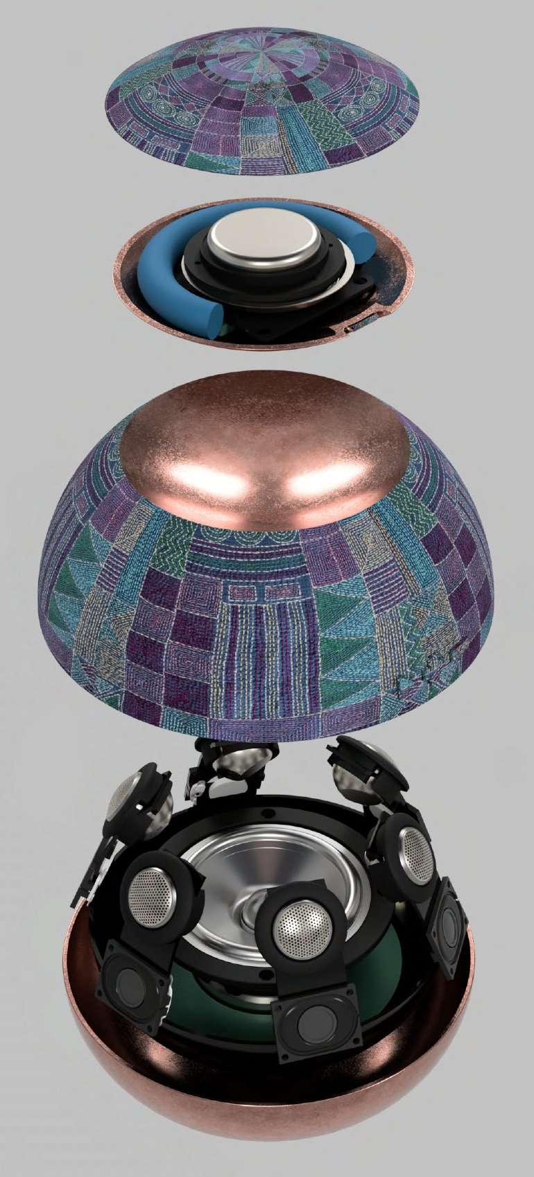 Thisspeakerisnotjustapieceofaudio equipment,butitalsoisapieceofartthat empowerstheruralskills-Kanthaand hand-formedcoppersheet;presentinIndia.