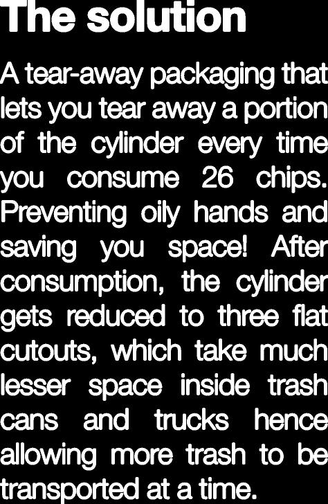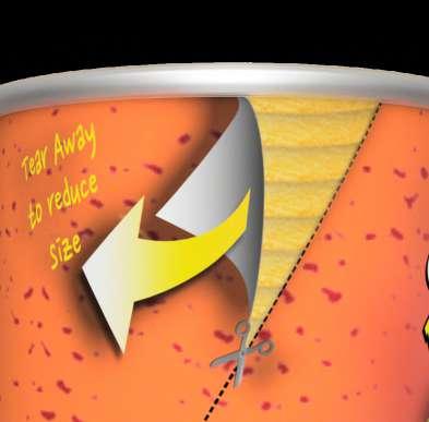 Atear-awaypackagingthat letsyoutearawayaportion ofthecylindereverytime youconsume26chips. Preventingoilyhandsand savingyouspace!After consumption,thecylinder getsreducedtothreefat cutouts,whichtakemuch lesserspaceinsidetrash cansandtruckshence allowingmoretrashtobe transportedatatime.
