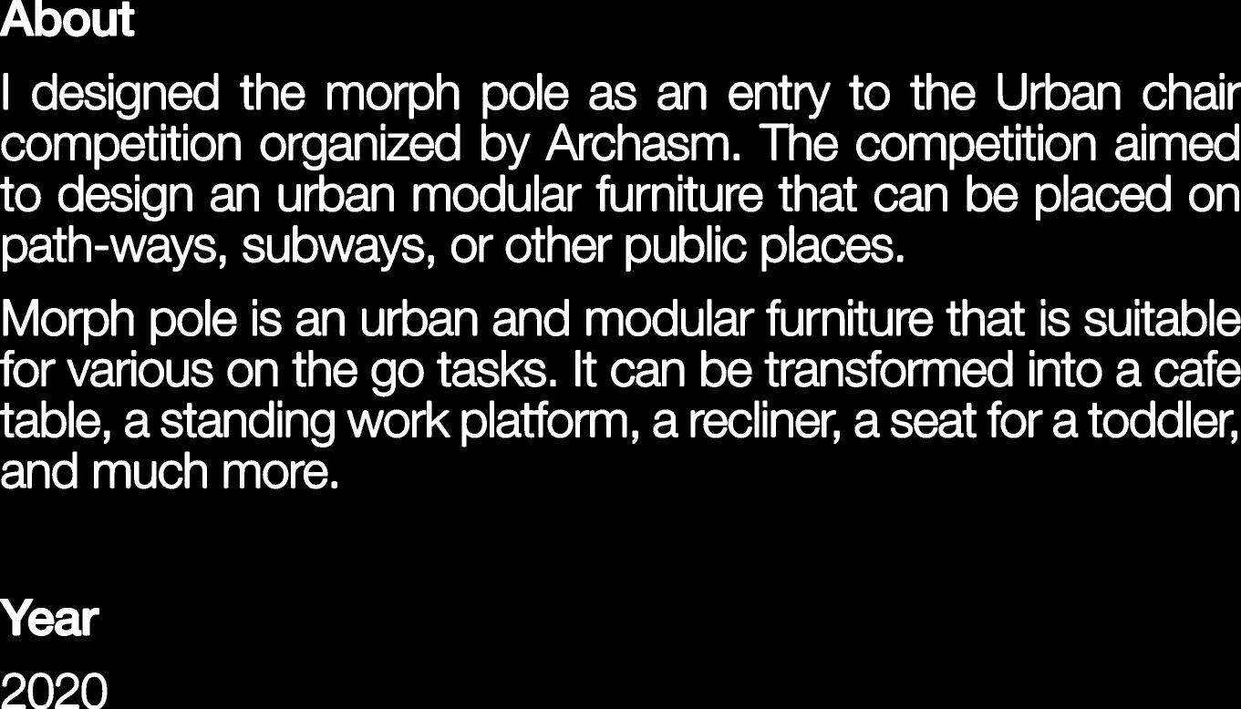 IdesignedthemorphpoleasanentrytotheUrbanchair competitionorganizedbyArchasm.Thecompetitionaimed todesignanurbanmodularfurniturethatcanbeplacedon path-ways,subways,orotherpublicplaces.