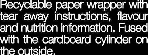 Recyclablepaperwrapperwith tearawayinstructions,favour andnutritioninformation.Fused withthecardboardcylinderon theoutside.