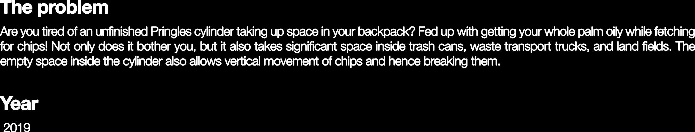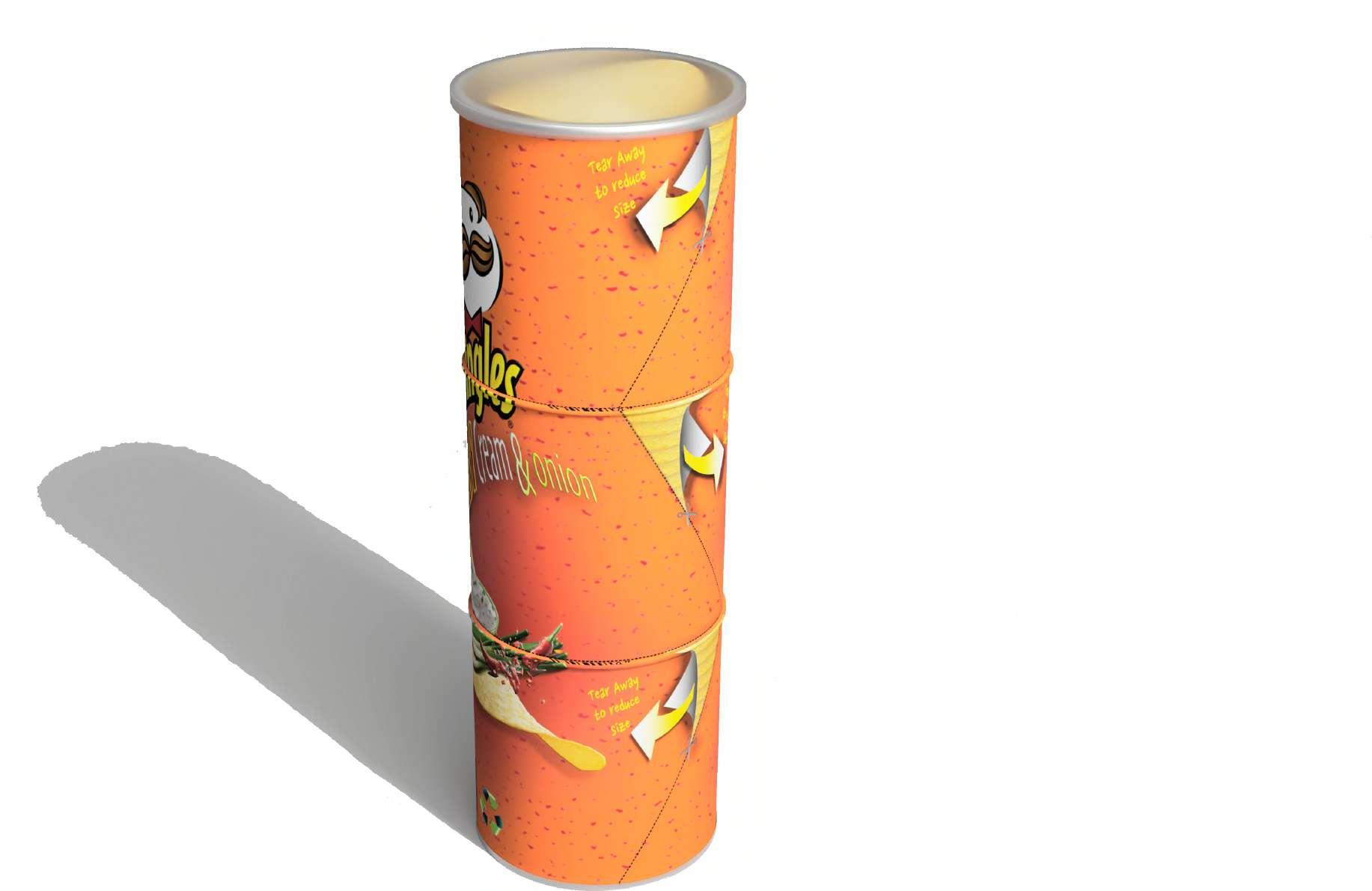 AreyoutiredofanunfnishedPringlescylindertakingupspaceinyourbackpack?Fedupwithgettingyourwholepalmoilywhilefetching forchips!Notonlydoesitbotheryou,butitalsotakessignifcantspaceinsidetrashcans,wastetransporttrucks,andlandfelds.The emptyspaceinsidethecylinderalsoallowsverticalmovementofchipsandhencebreakingthem.