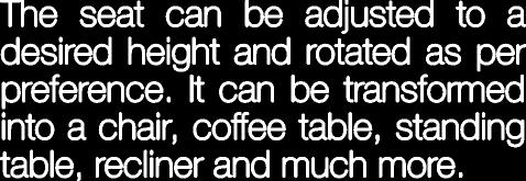 Theseatcanbeadjustedtoa desiredheightandrotatedasper preference.Itcanbetransformed intoachair,cofeetable,standing table,reclinerandmuchmore.