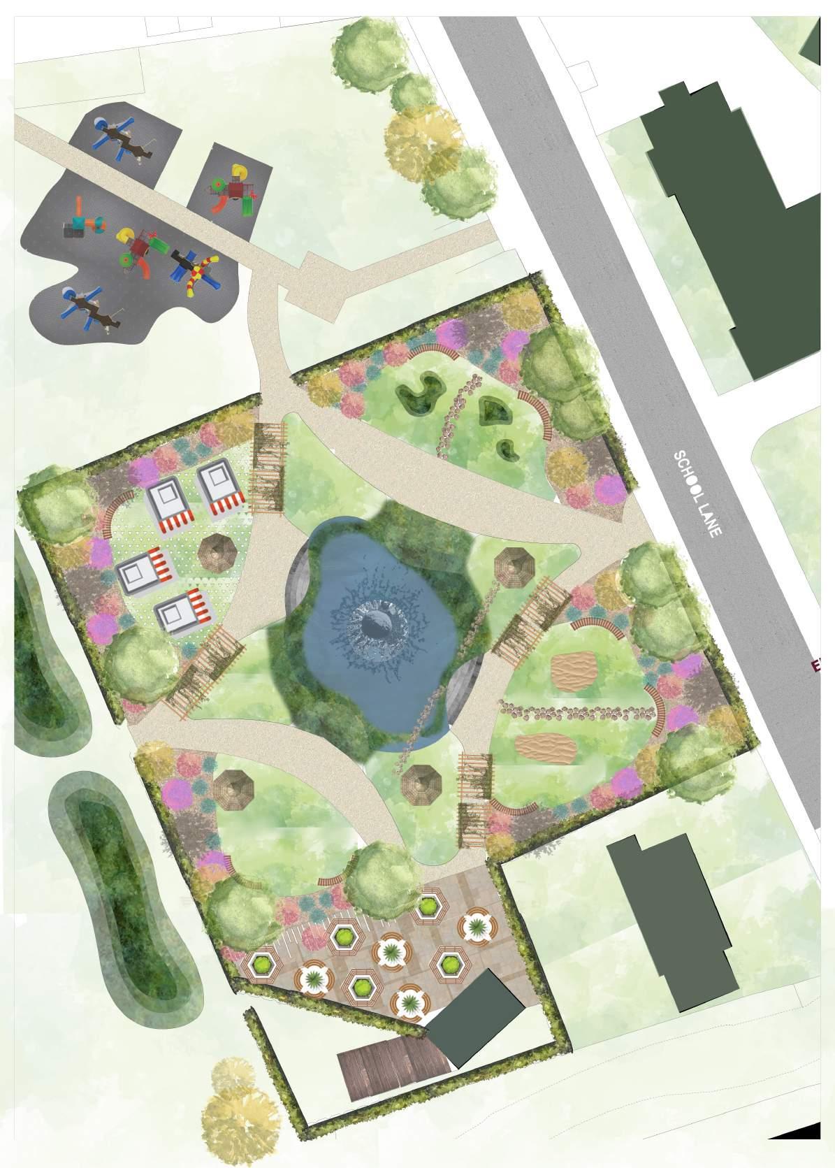 Numerous materials, both soft and hard, have been integrated into this specific area to ensure a harmonious and sustainable design. EccoGravel, a permeable paving solution that facilitates water drainage into the ground, potentially benefiting the nearby pond. Perennials, trees, and hedges, showcasing the diverse vegetation intended to imbue the space with naturalistic colors, textures, and a genuine sense of place. These plants not only offer seasonal interest but also create hiding spots for children, particularly beneficial for those experiencing panic attacks associated with conditions like ASD and ADHD.
