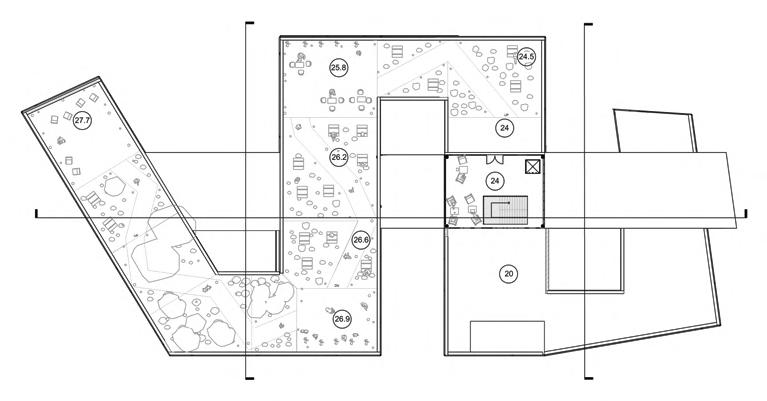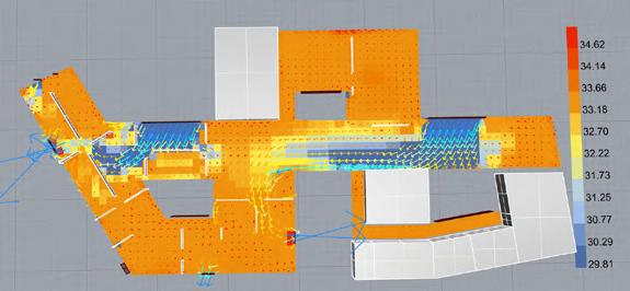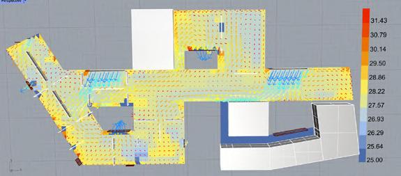 Pour étudier l’impact des patios (en vert) sur la circulation de l’air et le transfert de chaleur, nous avons réalisé la simulation suivante : À l’étage de l’exposition, avec une température initiale de 35°C : L’air froid entre par les ouvertures du volume en verre, alignées avec les vents dominants. Cela réduit la chaleur à 29,81°C, mais l’effet est limité par l’absence de courants d’air.
