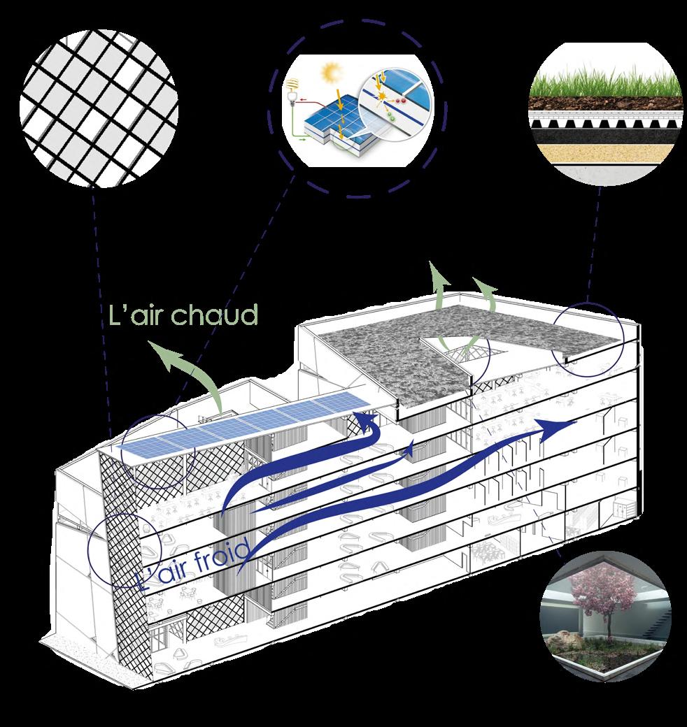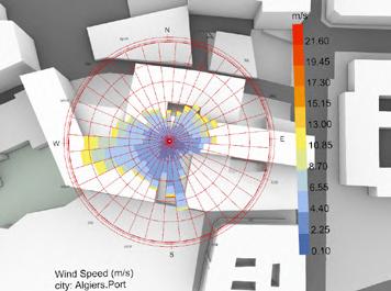 La simulation est réalisée avec le logiciel «Ladybug Tools» qui permet d’intégrer la géométrie du projet dans d’autres logiciels d’analyse comme «OpenStudio», «EnergyPlus», «OpenFoam» et «Radiance» qui utilisent les données climatiques d’Alger au format EPW pour fournir des simulations en temps réel de l’éclairage, l’énergie, la dynamique des fluides et la température. Dans le but d’assurer un confort annuel tout en réduisant la consommation d’énergie et les coûts d’exploitation d’un bâtiment, ainsi que son empreinte carbone, divers dispositifs climatiques ont été intégrés, notamment des patios, des brise-soleils, une terrasse végétalisée et des panneaux photovoltaïques, dès la phase de conception.