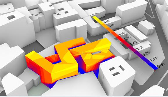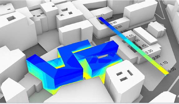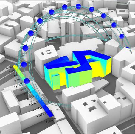 La figure à gauche montre les heures d’exposition au soleil des surfaces du volume. L’orientation Nord pour la grande façade vitrée (couleur verte) évite tout risque de surchauffe ou d’effet de serre car elle reçoit peu d’ensoleillement. Ainsi, il devient possible d’ouvrir.