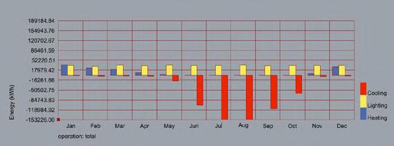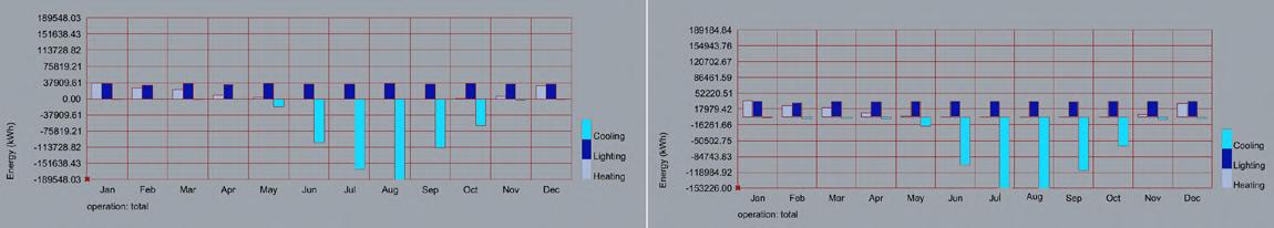 Dans le premier scénario: l’énergie de la climatisation (en rouge) atteint 189548 KWh, l’énergie totale consommée par le bâtiment est de 1123294 KWh (112 KWh/m²) et les émissions CO2 sont d’ordre de 52.045 Kg/m². Dans le deuxième scénario, l’énergie de la climatisation est réduite jusqu’à 153226 KWh, l’énergie totale est de 951944 kwh (95.251 kwh/m²) et de 38.086 Kg/ m² pour les émissions de CO2.