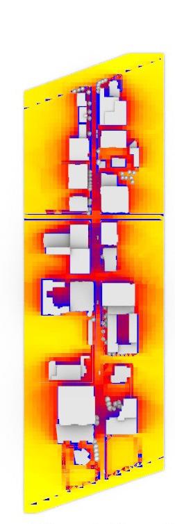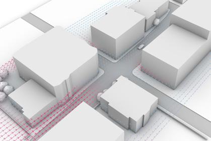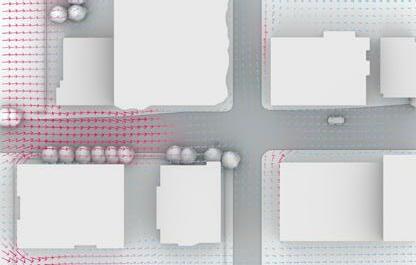 A simulation created using Butterfly plugin in grasshopper to capture wind behaviour when it encounters buildings in this segment of street assuming that all wind direction is coming from north.