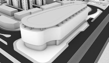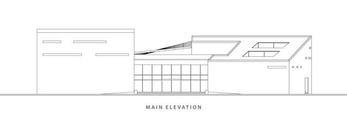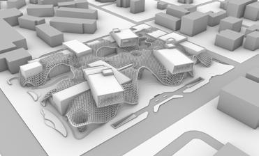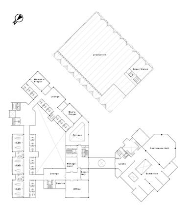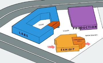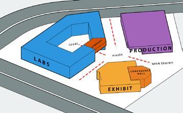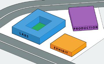 1. Three main masses, the exhibit and the labs located on the main road while the production area to be in the the back on the second road.