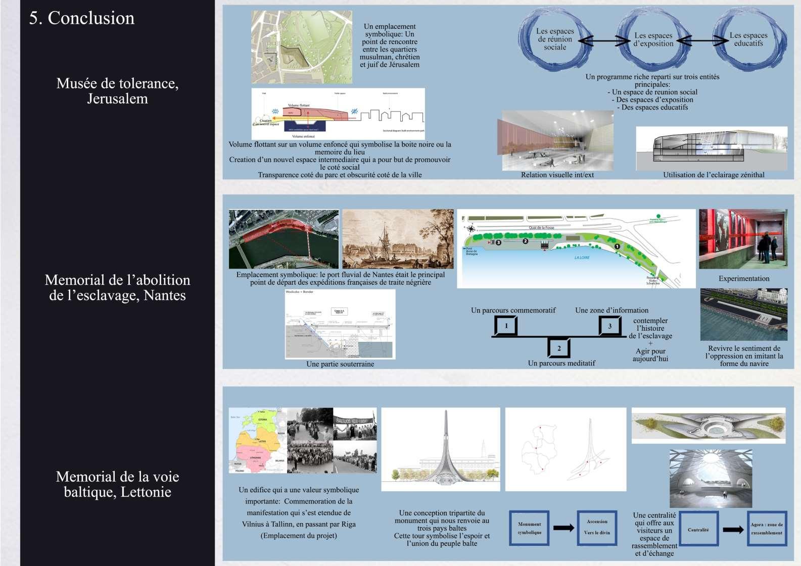 Remerciement 2 Sommaire :............................................................................................................................ 3 Préambule : 5 Introduction : ........................................................................................................................ 6 Problématique :..................................................................................................................... 9 Méthodologie : 11 État de l’art :....................................................................................................................... 12 Premiere partie : Le carde théorique 16 Introduction : ...................................................................................................................... 17 I. La coexistence religieuse en Tunisie : 18 1. La coexistence religieuse : Un nouveau concept ?.....................................................18 2. Les principes fondamentaux de la tolérance et la coexistence : 23 3. L’état de la coexistence en Tunisie :.........................................................................24 II. Le dialogue interreligieux : 34 1. Définition : 34 2. Le role et méthode du dialogue interreligieux :.........................................................34 3. Les manifestations tenues en Tunisie : 37 III. La coexistence et l’art, la sociologie et la pédagogie :.............................................. 41 1. Le rapport à l’art et la culture : 41 2. Le rapport au côté social :.........................................................................................47 3. Le rapport au côté pédagogique : 47 Conclusion :........................................................................................................................ 49 Deuxième partie : Analyse des références architecturales : 50 Introduction : 51 1. Le musée de la tolérance (Jérusalem) :......................................................................53 2. Le mémorial de l’abolition de l’esclavage (Nantes) : 60 3. Le mémorial de la voie baltique (Lettonie) : .............................................................67 Conclusion 71 troisieme partie :La réponse architecturale........................................................................... 72