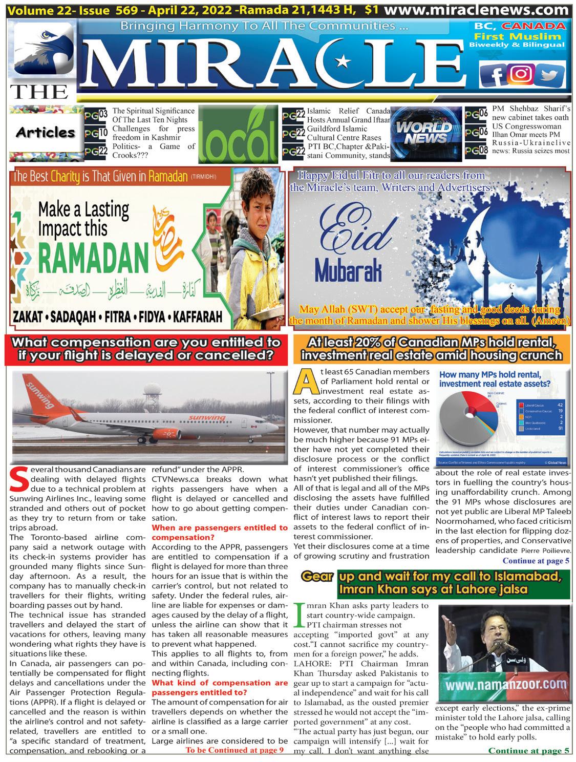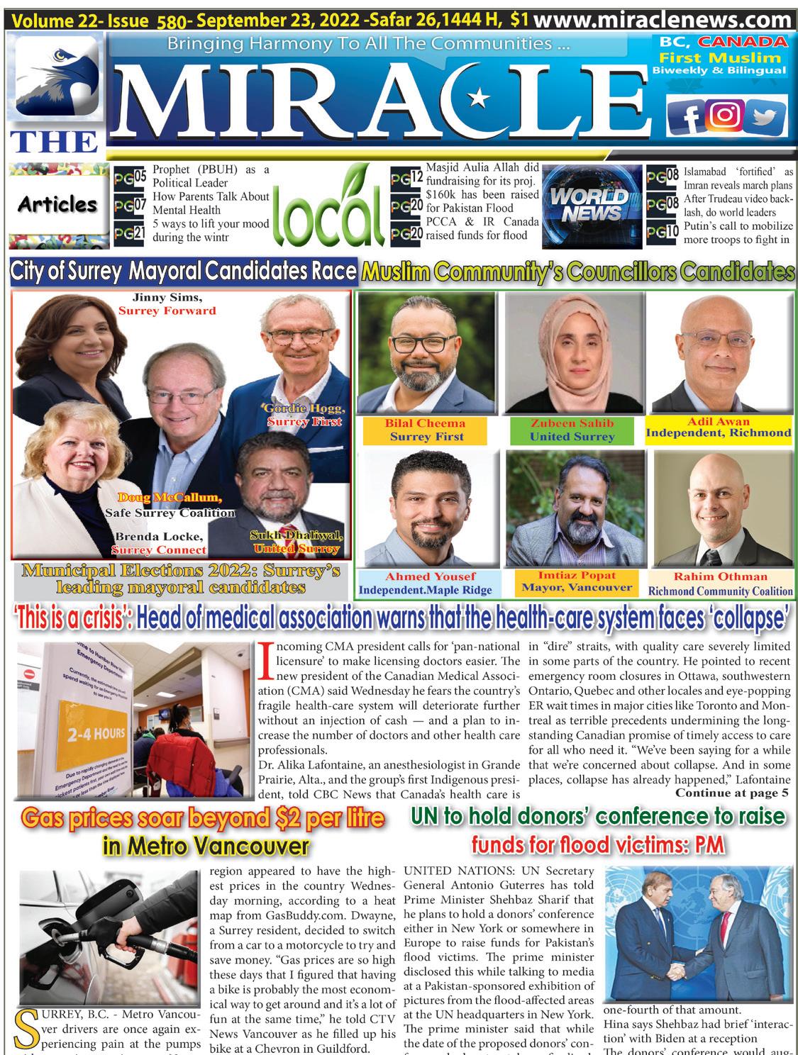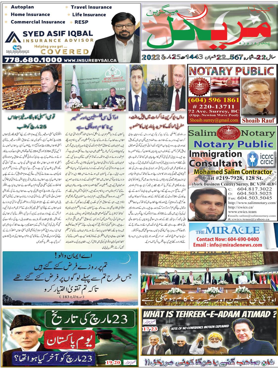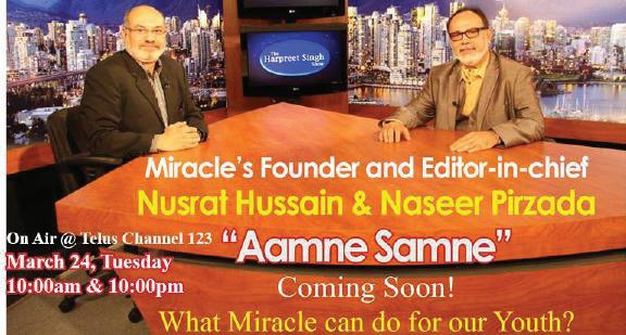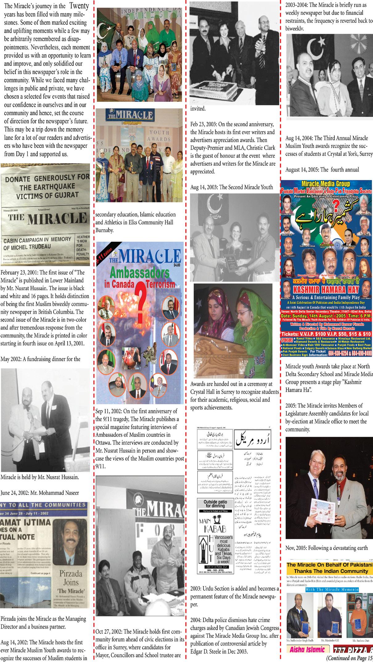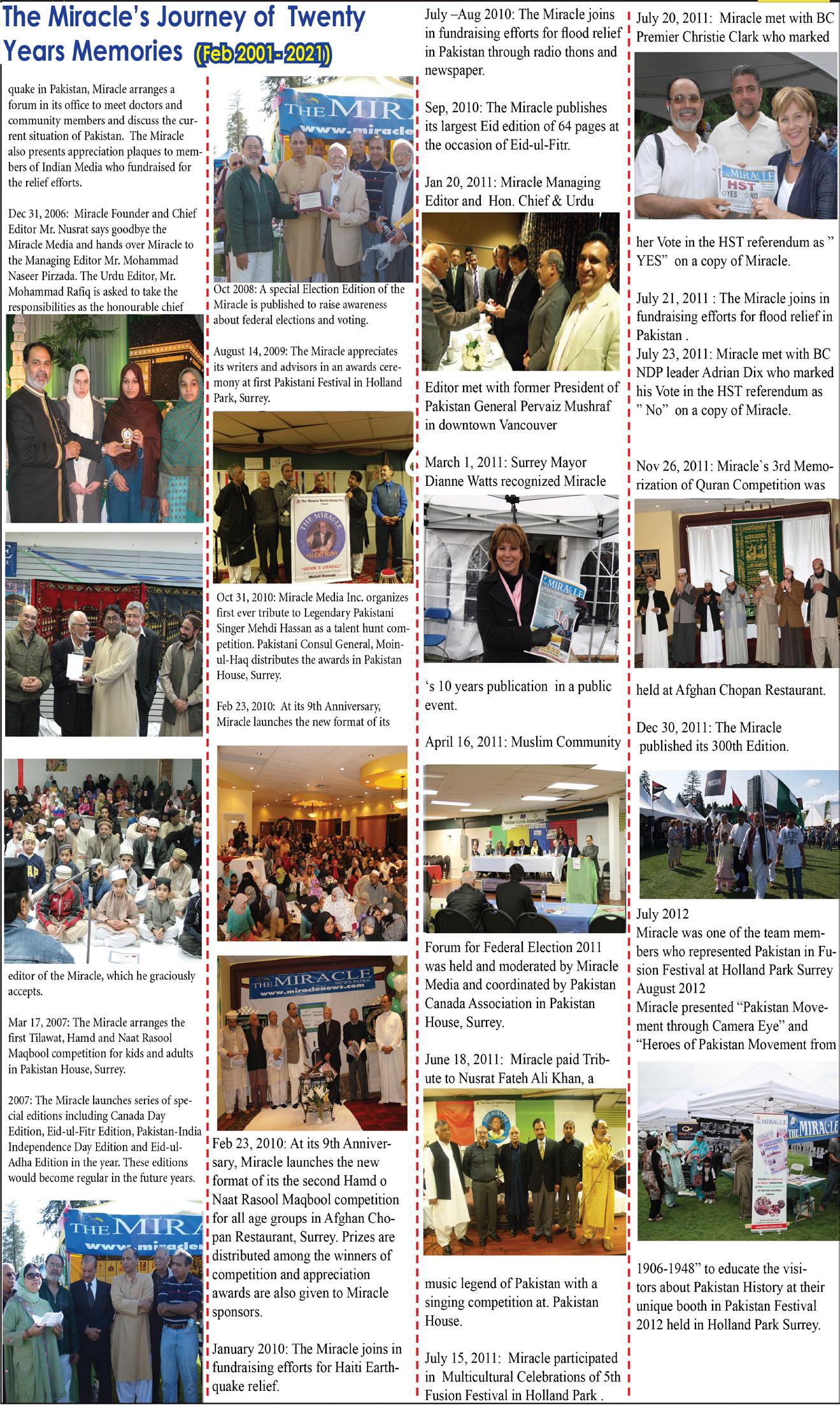 16 17 Miracle Journey & Top Stories 2022 Page at 22nd Anniversary Rajab 14 1442 February 26, 2021 MIRACLE SPECIAL The Miracle’s Journey of Twenty Years Memories (Feb 2001- 2021) 7 To be Continued at Page 13 Rajab 14 1442 February 26, 2021 MIRACLE SPECIAL 13 Continued from page To be Continued at Page 21 The Miracle’s Journey of Twenty Years Memories (Feb 2001- 2021) March 2, 2013: On its 12th Anniversary, Miracle Media launched its new edition of all colour pages. Awards were given to Miracle’s Writers. The awards were distributed by Consul General of Pakistan and Deputy Consul General Ms. Batool Kazim at Afghan Chopan Banquet Hall & Restaurant in Surrey. March 2, 2013: On its 12th Anniversary, Miracle organized Ghazal (Eastern Music) program in which many young and senior singers participated. Miracle Media acknowledged their skills of singing and prizes were distributed by Consul General of Pakistan Mr. Shuja Alam. April 24, 2013: A great debate between candidates of all Provincial political parties for May Elections was arranged by Miracle Media Group in collaboration with Pakistan Canada Association in Pakistan House. March 26, 2013: Miracle Media participated in the Provincial Elections 2013 by providing media coverage of each political party and interviewing many candidates for MLA. BC Liberal party’s candidate Christy Clark shared her views with Mr. Pirzada at Taj Banquet hall in Surrey. July 18, 2014: Miracle Media was one of the team members who represented Pakistan in 8th Fusion Festival at Holland Park in Surrey. December 18, 2013: Managing editor of the Miracle Media met with Mr. Justin Trudeau, Federal Liberal party leader at that time, at the Fairmont Pacific Rim in Vancouver and discussed many issues facing Canada and Muslim communities. This interview was facilitated by Mr. Bilal Cheema. July 18, 2013: Miracle Media was one of the team members who represented Pakistan in 7th Fusion Festival at Holland Park in Surrey. October 23, 2014: Miracle Media was one of the South Asian Media who joined in Debate and Q & A session of Surrey mayoral candidates’ first candidate meeting at SFU Surrey Campus To be Continued at Page 25 Rajab 14 1442 February 26, 2021 MIRACLE SPECIAL The Miracle’s Journey of Twenty Years Memories (Feb 2001- 2021) 21 Continued from page 13 25 March 24, 2015: Miracle Media Founder and Editor in-chief appeared on talk show on Joy Tv and discussed community issues. April 16, 2015: Miracle Media was one of the protesters against Indian Prime Minister Narendra Modi, socalled rock-star politician and Prime Minister Stephen Harper at their visit of the Sikh temple on Ross Street in Vancouver. Protest was against his time as CM of Gujarat and his order of brutal killings of Gujarat Muslims in India. September 5, 2015: Miracle Media Group announced the Grand Debate for Federal Election 2015 as a joint venture with BC Muslim Print Media October 3, 2015 BC Muslim Media held Grand Debate of all parties Candidates in which Muslims participated in historical numbers. BC Muslim Media is a temporary group of three different and independent Muslim Newspapers, Canada Times, Community Time Canada and The Miracle. December 25, 2015 Alhamdulillah Miracle Media Group completed consecutive 400 Editions on December 25, August 14, 2016, The Miracle Media was the Media partner of Fifth Pakistan Festival 2016 at 70th Pakistan’s independence Day To be Continued at Page 29 July 18, 2015 Jason Kenny, the Defence Minister at the time,with his staff and Surrey-Newton Conservative Candidate Mr. Harpreet Singh among them. Mr Naveed welcomed him and admired the Harper’s Government policies. Maulana Naumani made Duaa for the prosperity of Canada. Mr. Naveed provided the opportunity to community members to ask any question from Hon. J. Kenny. Many topics were discussed in which Daesh, Al Qaidah, Immigration policy during 2006-2015, Women’s Veil, Education policy, Taxes and many other issues. July, 18, 19, 2015 The 8th Fusion Festival took place at Holland Park. The new and interesting part of the parade was, that the Consul General of Pakistan Dr. Mohammad Tariq raised the Pakistani flag throughout the parade along with Mr. M. Afzal Malik and M. Naseer Pirzada of Miracle Media. July, 23, 2016 The 9th Fusion Festival took place at Holland Park. The new and interesting part of the parade was, that the Consul General of Pakistan Dr. Mohammad Tariq raised the Pakistani flag throughout the parade along with Mr. Fahad Amjad, Mr. M. Afzal Malik, Mr.Malik Irfan and M. N. Pirzada of Miracle Media. August 16, 2015: Thousands came together to celebrate Pakistan’s independence at British Columbia’s Fourth Pakistan Festival in Holland Park Surrey. The event provided window into Pakistan’s arts and crafts, cuisine, fashion and music and was a joint effort led by the Pakistani Consulate in Vancouver, Miracle Media was the major Print Media partner of this event. March 15 2015: Justin Trudeau Press Conference with South Asian Media The Leader of Federal Liberal Party of Canada Justin Trudeau had press conference with South Asian Media From Muslim media, The Miracle, Al Ameen, Community Times Canada and Sohni Darthi of Pakistan were participants. The Miracle’s Journey of Twenty Years Memories (Feb 2001- 2021) Rajab 14 1442 February 26, 2021 MIRACLE SPECIAL Continued from page 21 Shaban 4,1444 February 24 ,2023 Shaban 4,1444 February 24 ,2023