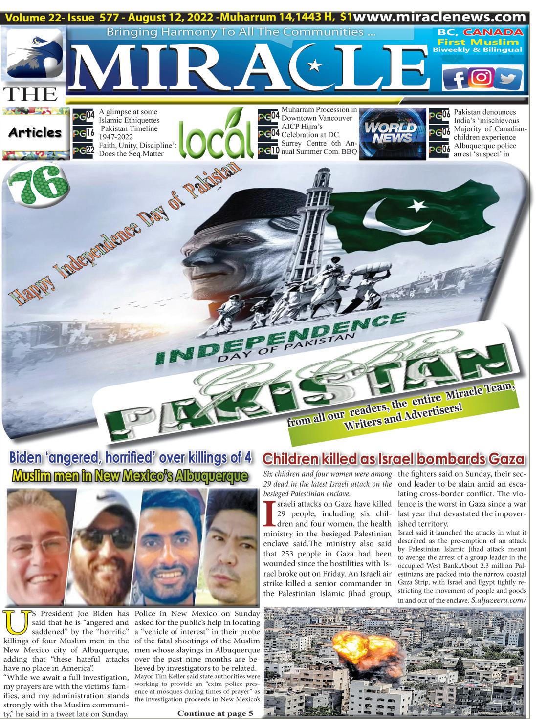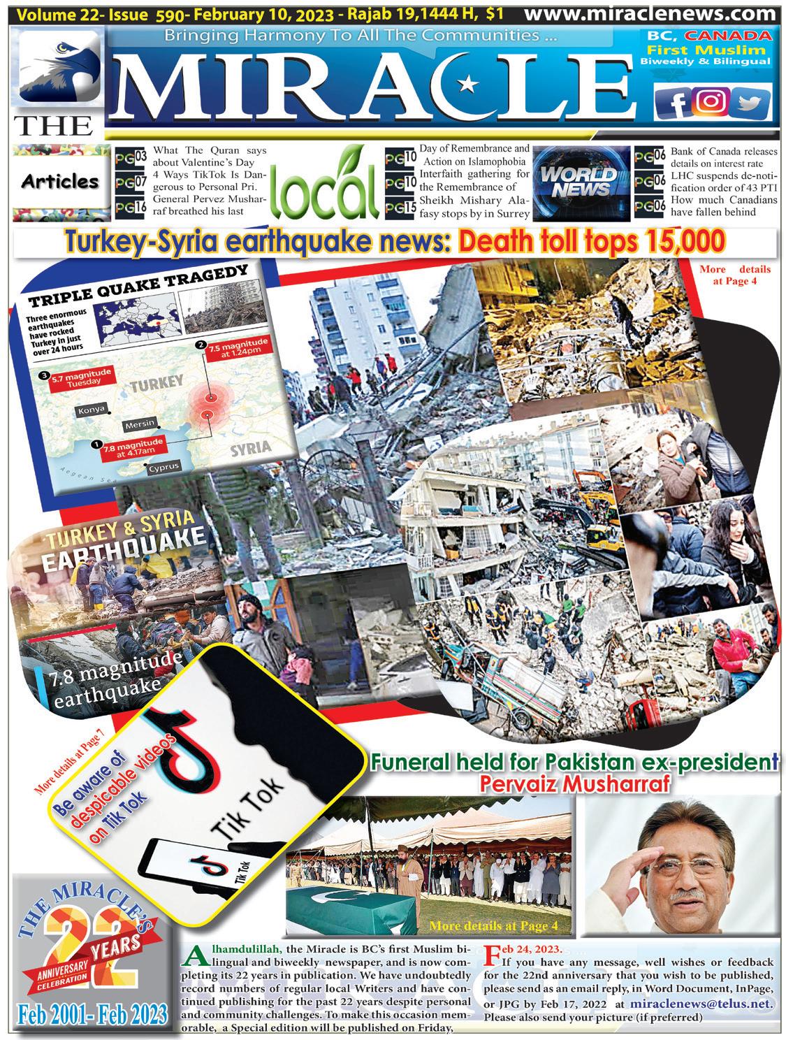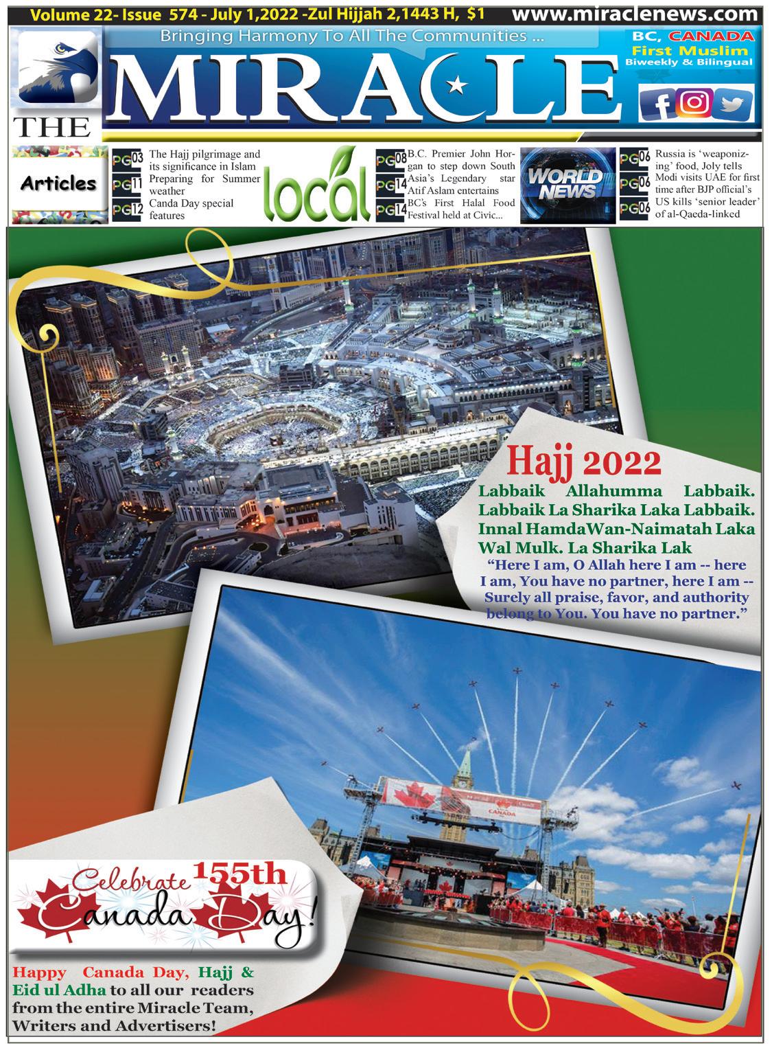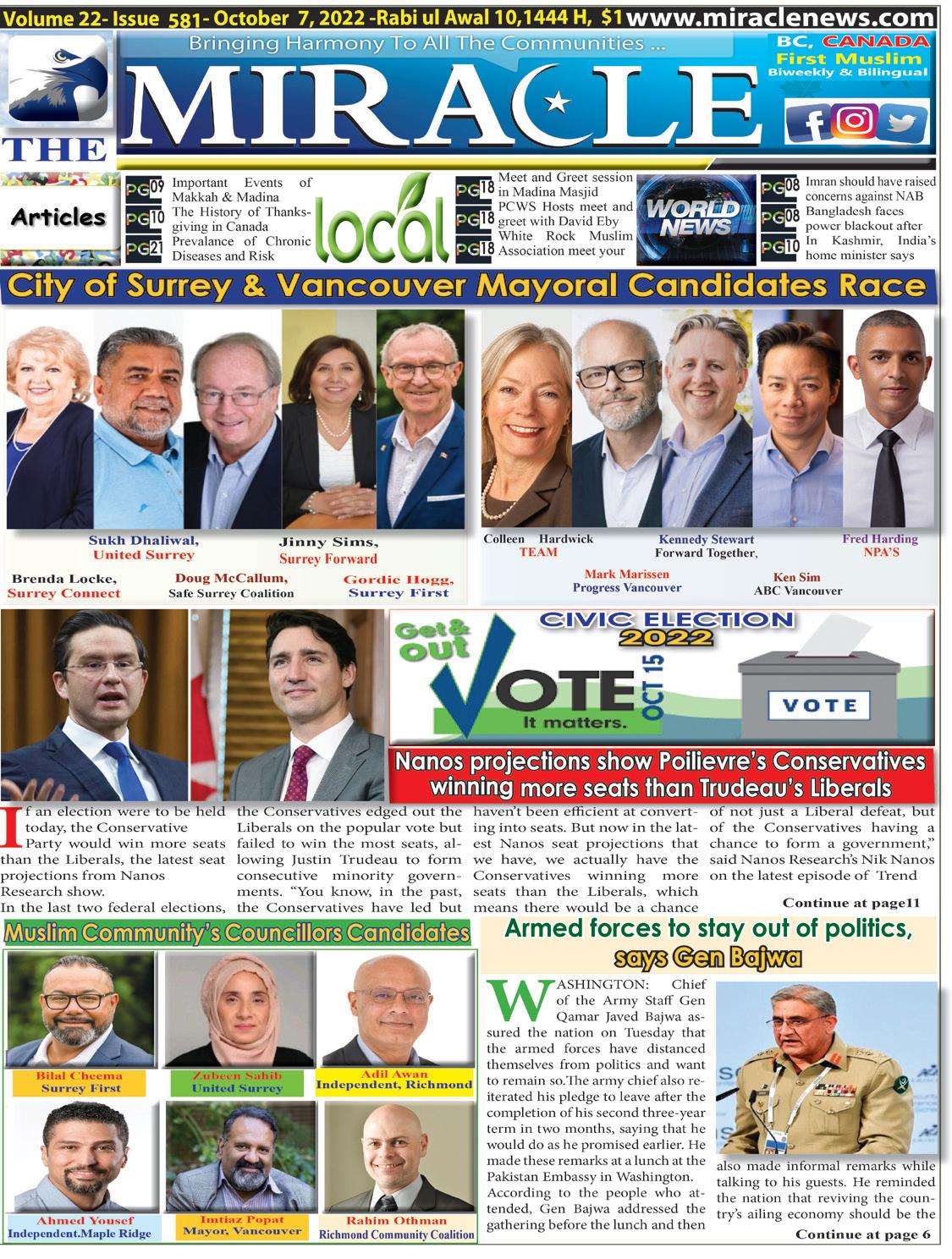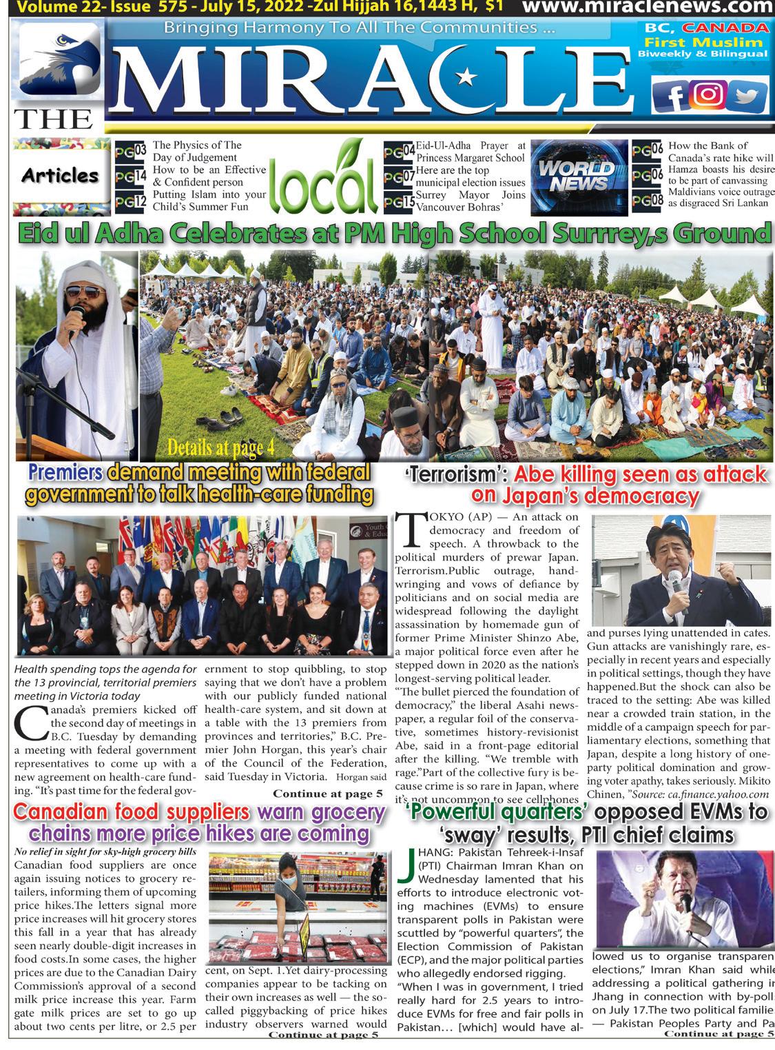 16 17 Miracle Journey & Top Stories 2022 Page at 22nd Anniversary Rajab 14 1442 February 26, 2021 MIRACLE SPECIAL The Miracle’s Journey of Twenty Years Memories (Feb 2001- 2021) 7 To be Continued at Page 13 Rajab 14 1442 February 26, 2021 MIRACLE SPECIAL 13 Continued from page To be Continued at Page 21 The Miracle’s Journey of Twenty Years Memories (Feb 2001- 2021) March 2, 2013: On its 12th Anniversary, Miracle Media launched its new edition of all colour pages. Awards were given to Miracle’s Writers. The awards were distributed by Consul General of Pakistan and Deputy Consul General Ms. Batool Kazim at Afghan Chopan Banquet Hall & Restaurant in Surrey. March 2, 2013: On its 12th Anniversary, Miracle organized Ghazal (Eastern Music) program in which many young and senior singers participated. Miracle Media acknowledged their skills of singing and prizes were distributed by Consul General of Pakistan Mr. Shuja Alam. April 24, 2013: A great debate between candidates of all Provincial political parties for May Elections was arranged by Miracle Media Group in collaboration with Pakistan Canada Association in Pakistan House. March 26, 2013: Miracle Media participated in the Provincial Elections 2013 by providing media coverage of each political party and interviewing many candidates for MLA. BC Liberal party’s candidate Christy Clark shared her views with Mr. Pirzada at Taj Banquet hall in Surrey. July 18, 2014: Miracle Media was one of the team members who represented Pakistan in 8th Fusion Festival at Holland Park in Surrey. December 18, 2013: Managing editor of the Miracle Media met with Mr. Justin Trudeau, Federal Liberal party leader at that time, at the Fairmont Pacific Rim in Vancouver and discussed many issues facing Canada and Muslim communities. This interview was facilitated by Mr. Bilal Cheema. July 18, 2013: Miracle Media was one of the team members who represented Pakistan in 7th Fusion Festival at Holland Park in Surrey. October 23, 2014: Miracle Media was one of the South Asian Media who joined in Debate and Q & A session of Surrey mayoral candidates’ first candidate meeting at SFU Surrey Campus To be Continued at Page 25 Rajab 14 1442 February 26, 2021 MIRACLE SPECIAL The Miracle’s Journey of Twenty Years Memories (Feb 2001- 2021) 21 Continued from page 13 25 March 24, 2015: Miracle Media Founder and Editor in-chief appeared on talk show on Joy Tv and discussed community issues. April 16, 2015: Miracle Media was one of the protesters against Indian Prime Minister Narendra Modi, socalled rock-star politician and Prime Minister Stephen Harper at their visit of the Sikh temple on Ross Street in Vancouver. Protest was against his time as CM of Gujarat and his order of brutal killings of Gujarat Muslims in India. September 5, 2015: Miracle Media Group announced the Grand Debate for Federal Election 2015 as a joint venture with BC Muslim Print Media October 3, 2015 BC Muslim Media held Grand Debate of all parties Candidates in which Muslims participated in historical numbers. BC Muslim Media is a temporary group of three different and independent Muslim Newspapers, Canada Times, Community Time Canada and The Miracle. December 25, 2015 Alhamdulillah Miracle Media Group completed consecutive 400 Editions on December 25, August 14, 2016, The Miracle Media was the Media partner of Fifth Pakistan Festival 2016 at 70th Pakistan’s independence Day To be Continued at Page 29 July 18, 2015 Jason Kenny, the Defence Minister at the time,with his staff and Surrey-Newton Conservative Candidate Mr. Harpreet Singh among them. Mr Naveed welcomed him and admired the Harper’s Government policies. Maulana Naumani made Duaa for the prosperity of Canada. Mr. Naveed provided the opportunity to community members to ask any question from Hon. J. Kenny. Many topics were discussed in which Daesh, Al Qaidah, Immigration policy during 2006-2015, Women’s Veil, Education policy, Taxes and many other issues. July, 18, 19, 2015 The 8th Fusion Festival took place at Holland Park. The new and interesting part of the parade was, that the Consul General of Pakistan Dr. Mohammad Tariq raised the Pakistani flag throughout the parade along with Mr. M. Afzal Malik and M. Naseer Pirzada of Miracle Media. July, 23, 2016 The 9th Fusion Festival took place at Holland Park. The new and interesting part of the parade was, that the Consul General of Pakistan Dr. Mohammad Tariq raised the Pakistani flag throughout the parade along with Mr. Fahad Amjad, Mr. M. Afzal Malik, Mr.Malik Irfan and M. N. Pirzada of Miracle Media. August 16, 2015: Thousands came together to celebrate Pakistan’s independence at British Columbia’s Fourth Pakistan Festival in Holland Park Surrey. The event provided window into Pakistan’s arts and crafts, cuisine, fashion and music and was a joint effort led by the Pakistani Consulate in Vancouver, Miracle Media was the major Print Media partner of this event. March 15 2015: Justin Trudeau Press Conference with South Asian Media The Leader of Federal Liberal Party of Canada Justin Trudeau had press conference with South Asian Media From Muslim media, The Miracle, Al Ameen, Community Times Canada and Sohni Darthi of Pakistan were participants. The Miracle’s Journey of Twenty Years Memories (Feb 2001- 2021) Rajab 14 1442 February 26, 2021 MIRACLE SPECIAL Continued from page 21 Shaban 4,1444 February 24 ,2023 Shaban 4,1444 February 24 ,2023