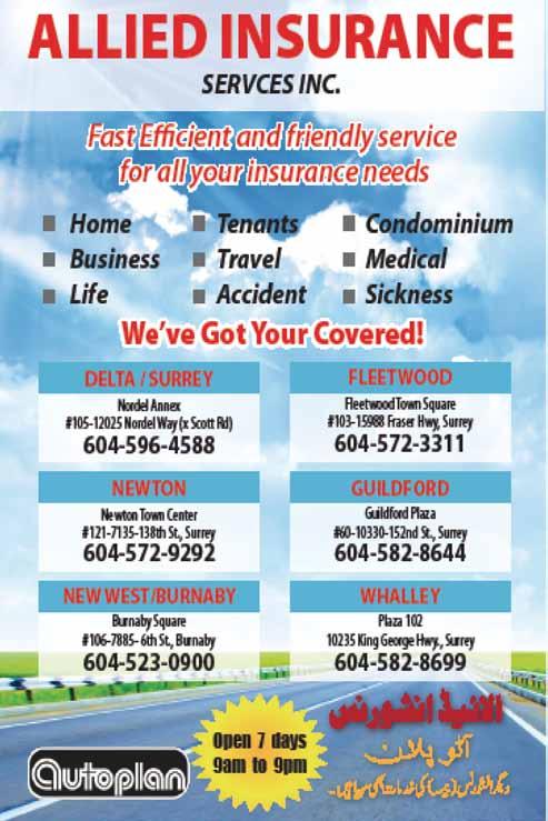 notary public Immigration Consultant mohamed Salim Contractor Unit #219-7928, 128 St. (York Business Centre) Surrey. BC V3W 4E8 C: 604.817.3022 O: 604.503.5025 Fax: 604.503.5045 http://www.salimnotary.com/ http://cwics.ca/ www.cwics.team Emails:salim@salimnotary.com &:cwics.team@yahoo.ca NOTARY PUBLIC (604) 596 1861 # 220-13711 72 Ave. Surrey, BC (Opp. Newton Wave Pool) Shoaib.surrey@gmail.com Shoaib Rauf Hotpan Pizza Second Location Open BARNEY’S PIZZA & FRIED CHICKEN Delicious Food For Every Mood Unit 348- 8140-128th Street, Surrey Unit 105-12889 84th Ave, Surrey ARSHAD SOHAL 778-565-4416 604-773-3883 BUSINESS HOURS: 11 am to 11 pm, Sun-Thu 11am to 12 pm, Fri & Sat Tuesday Closed BUSINESS HOURS: 12 pm to 12 am, Sun-Thu 12 pm to 2 am, Fri & Sat New Items: Malai Botti, Full Chargha, Tandori Fish