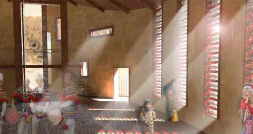 Due to the privation has existed since the earthquake, we have used recyclable materials like beverage bottles to make window glasses that was inspired by local fabric.