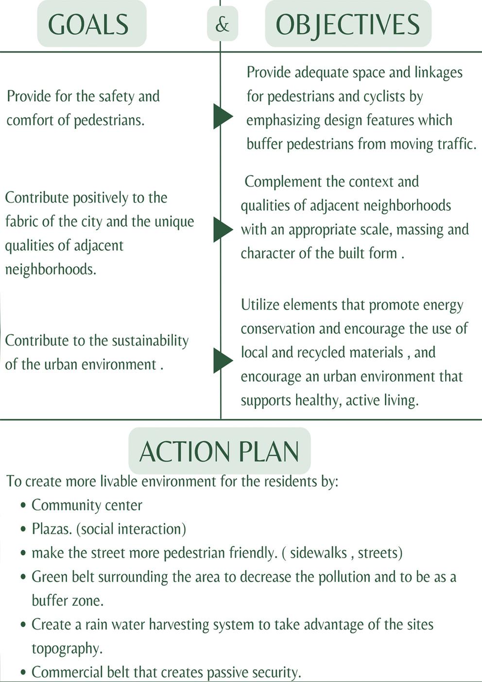 Amenities they require as well as acquiringthepublic'ssafety Focusing ontheyouthasabigforcethat'llshape theorganization. Keepingupwiththeindustrialzones and increasing the job opportunities fortheresidentsandnonresidents. Rehabilitation of roads to give an organizedorderandfollowingastreet hierarchy. Redesigningtheinfrastructurethat'll accommodate the necessary needs outsideandinsidethesuggestedplot forabetterqualityoflifefortheyouth 55