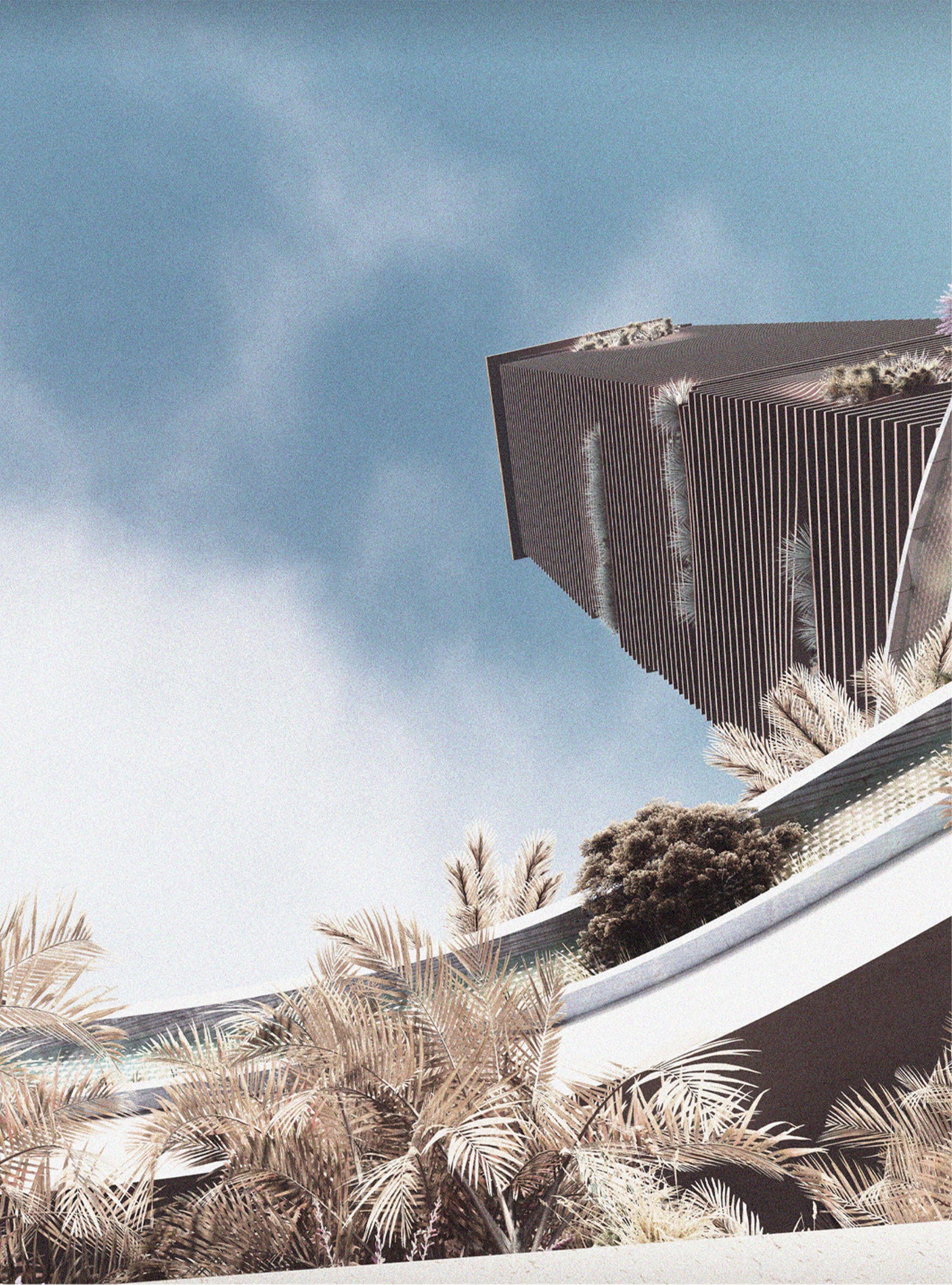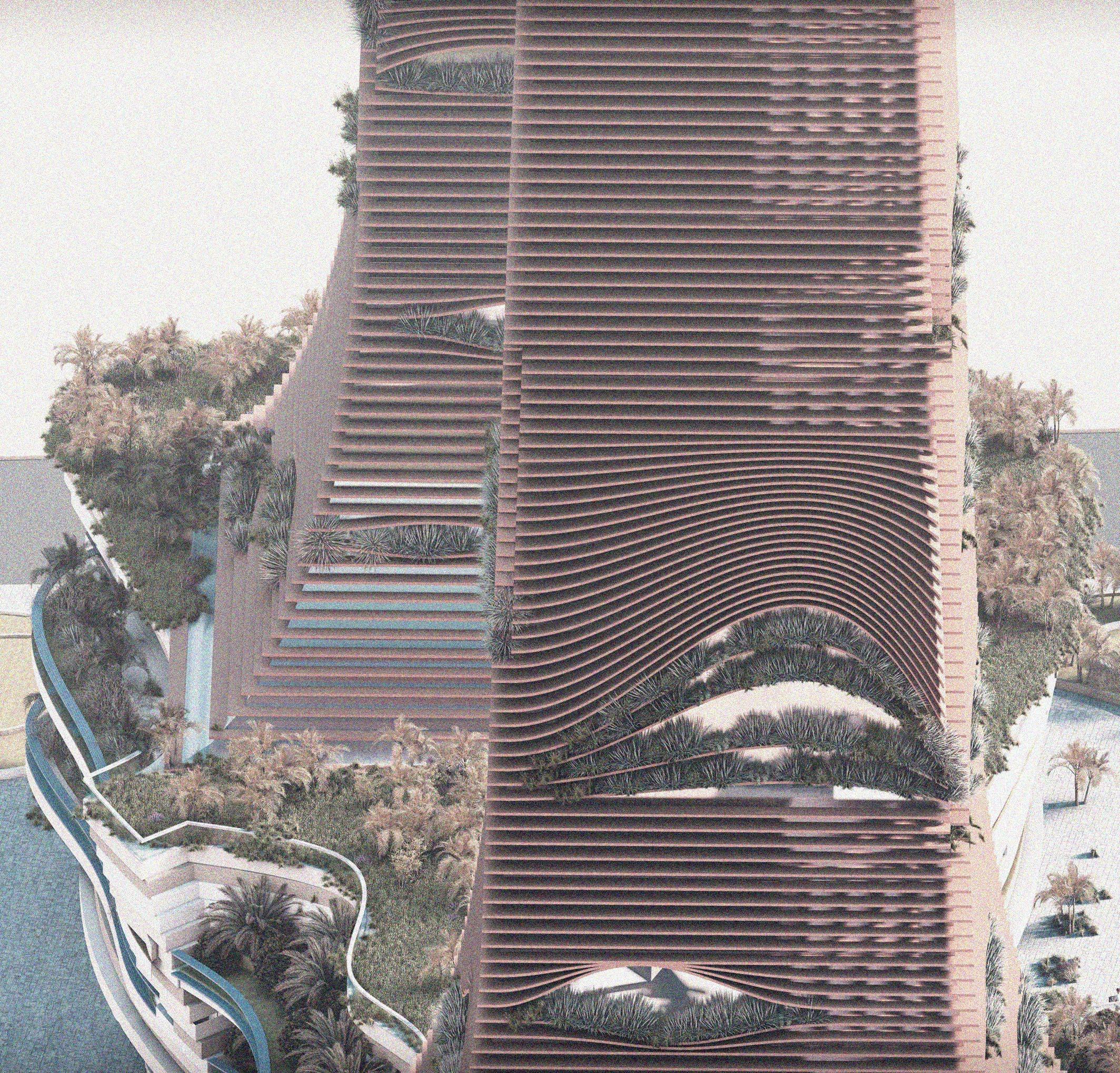 The Skyscrapers project is rooted in a design philosophy inspired by the concept of hanging gardens, exploring the seamless integration of architecture with its surrounding environment. This conceptual framework delves into the dynamic interplay between buildings and nature, drawing parallels to the iconic hanging gardens that harmoniously merged human-made structures with the natural world. The project delves into the profound influence of environmental forces on architectural form, examining factors such as erosion and the organic proliferation of vegetation cover.