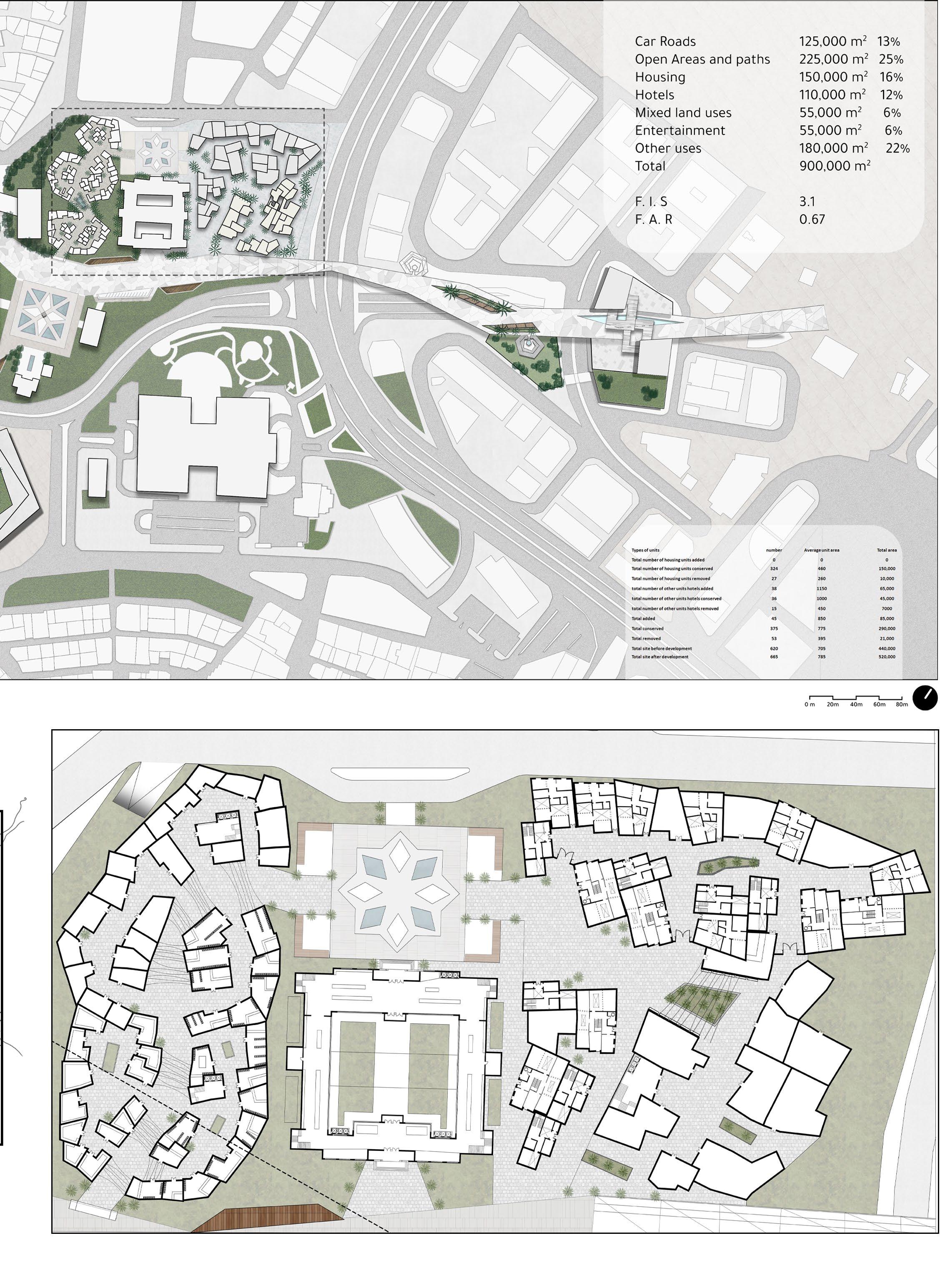 Reviving the vernacular architecture in Medina through reconstruction Housh Al-Rai and using it as an open gallery and adding a resort with the same old urban fabric of Medina and forming a traditional market with its well-known alleys.