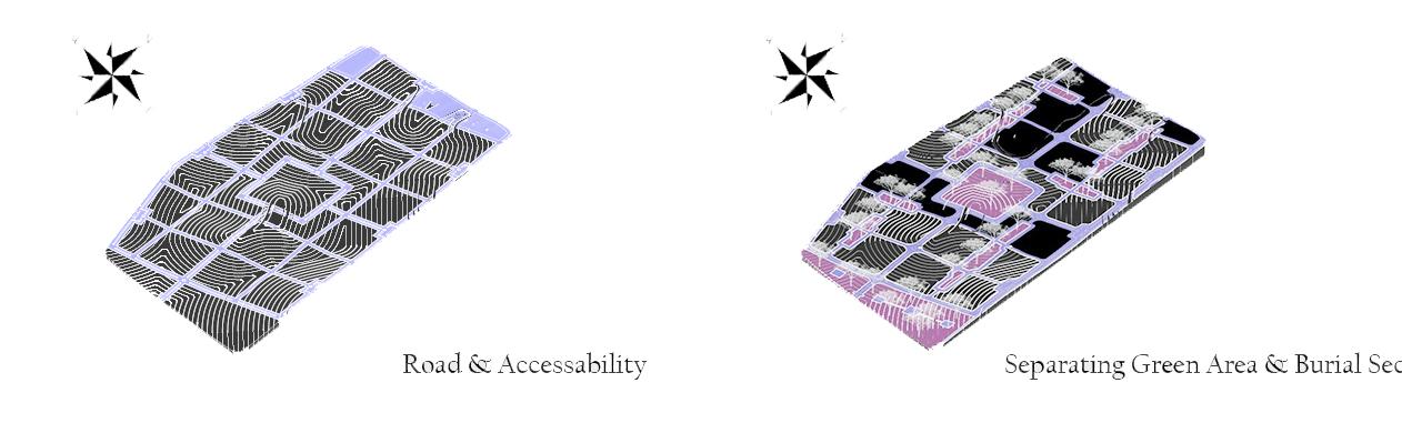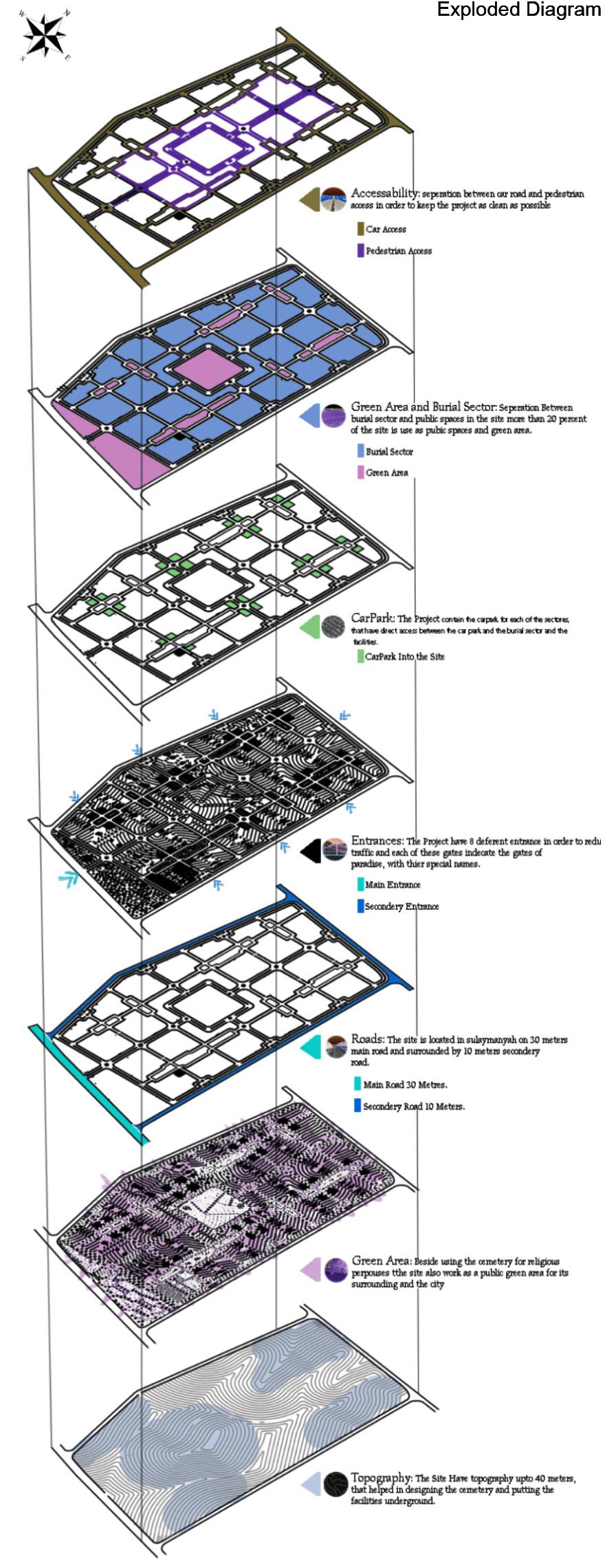 in the project i tried to Integrating cemetery with city environment and using it as a public space. Respecting cultural and religious belief which is attached to physical appearance of cemeteries. having religious spaces like (place for condolence). Applying landscape element inside cemetery areas to serve as a public space for the city like (Node (activi-ty area, seating area, fountain, plaza, sculpture ... etc.) The current cemeteries are not pre-de-signed, so its not favored to depend on them for Project capacity and the problems of existing cemeteries is that they dont having a carpark and clear en-trance.Poor arrangement of graves. Not having enough green area. No clear circulation area. Having a building over graves which is not allowed in Islamic regulations. Not express the culture of a community. Not satisfying physical appearance of overall Site. also focusing on Islamic Regula-tions. and centralization, all paths led to center of the project.