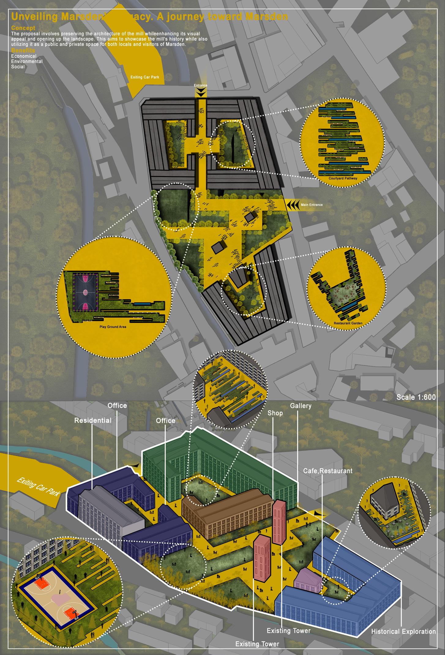 “Unveiling Marsden Legacy” reimagines the historic Marsden Mill as a nexus of community and innovation. We’ll restore its historical charm while creating versatile spaces for community gatherings and events, fostering a sense of belonging. Cutting-edge technology and sustainability will define the mill, showcasing renewable energy and eco-friendly design. Interactive exhibits and workshops will engage visitors and locals, offering insights into the mill’s past and its significance. Curated trails, scenic viewpoints, and local artisanal shops will elevate the visitor experience, inviting exploration and celebrating Marsden’s unique heritage. This design intent harmoniously blends history, community needs, and forward-thinking design to create a vibrant, sustainable space that embodies the spirit of Marsden’s legacy.