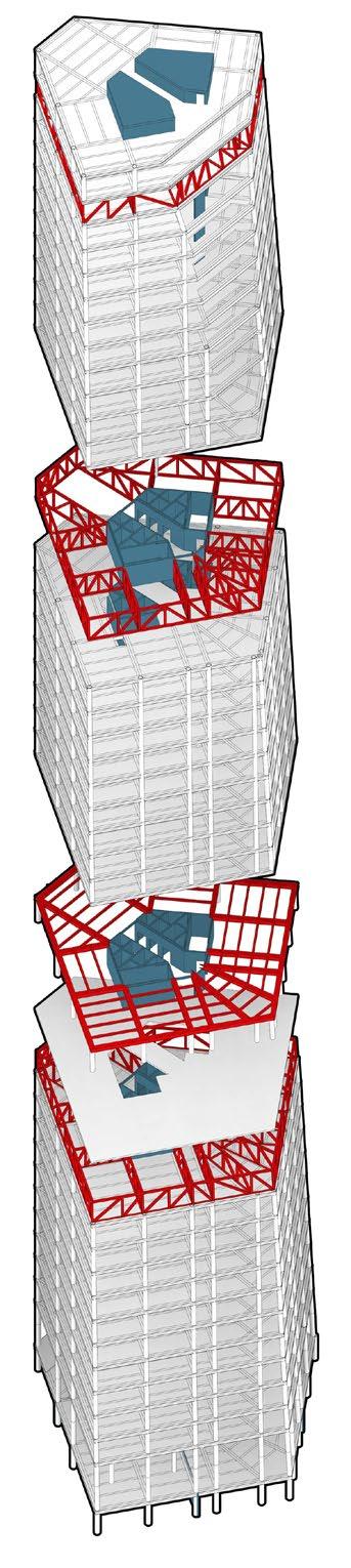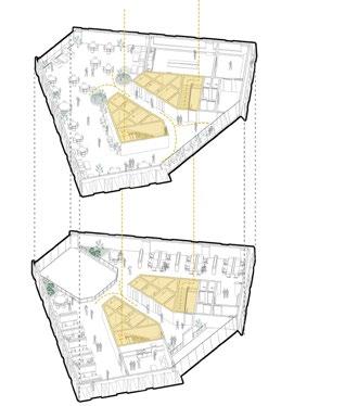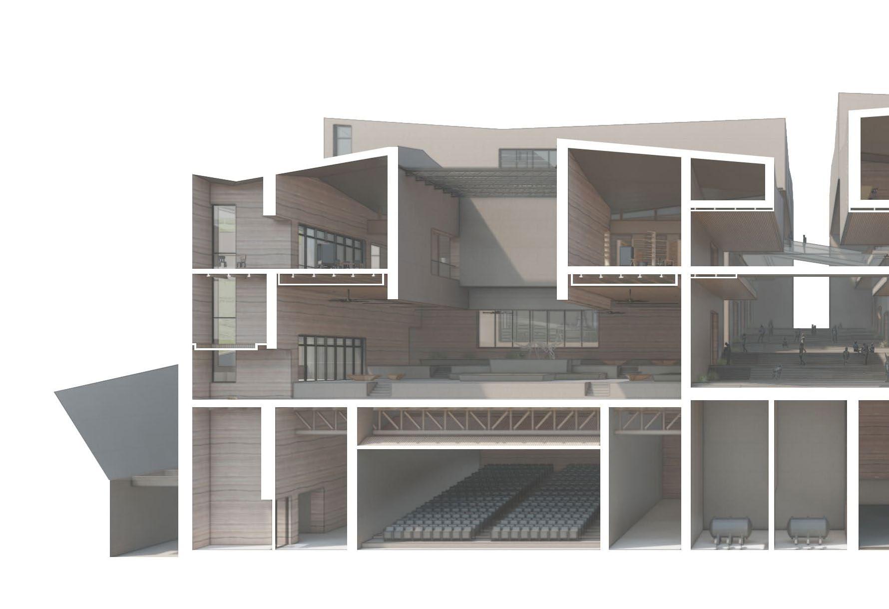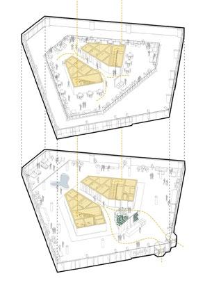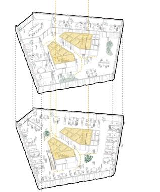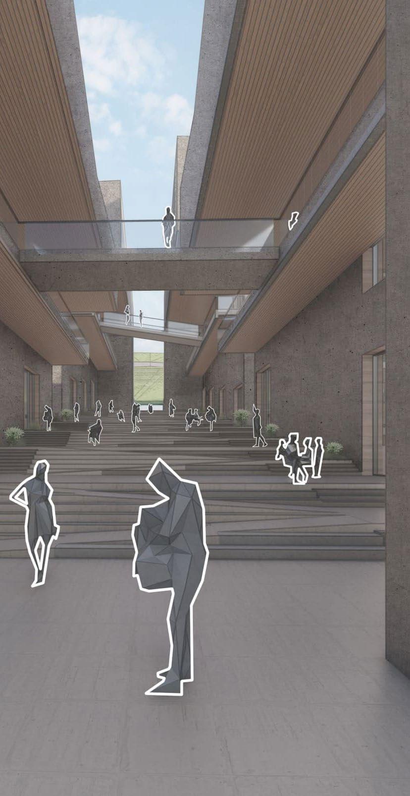 The synthesis between the layered/ fragmented architecture , as well as the social dimension and the vision of a library that connects/links the past to the presents produces a volume grouped according to the relationships of each program, and is “connected” by a central space which links all the other program creating an architecture that looks fragmented on the outside yet compacted/connected from within.